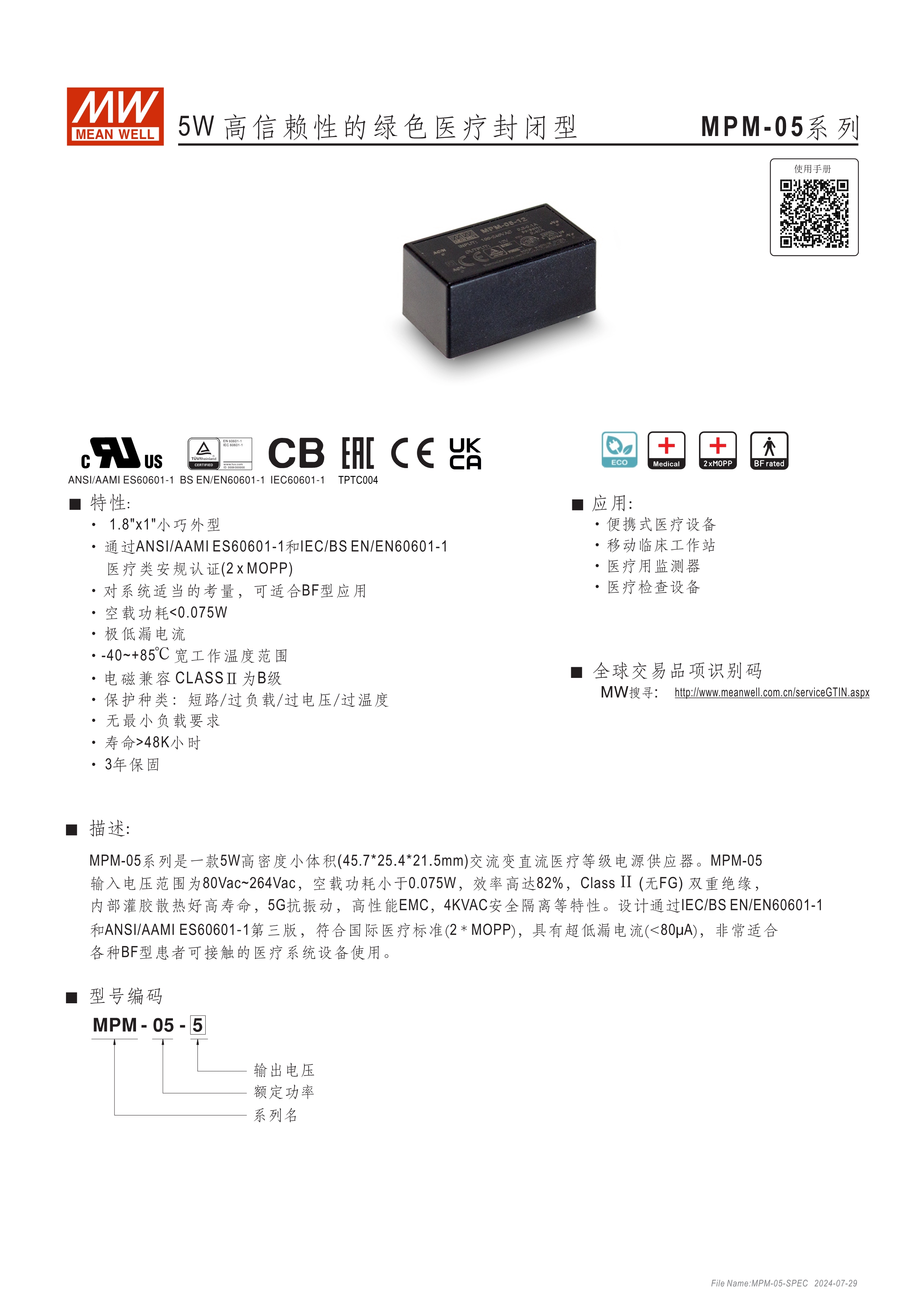 安裝于終端設(shè)備之PCB上 通過醫(yī)療類安規(guī)認證 (2xMOPP) 在適當系統(tǒng)條件下,適合用于BF應(yīng)用