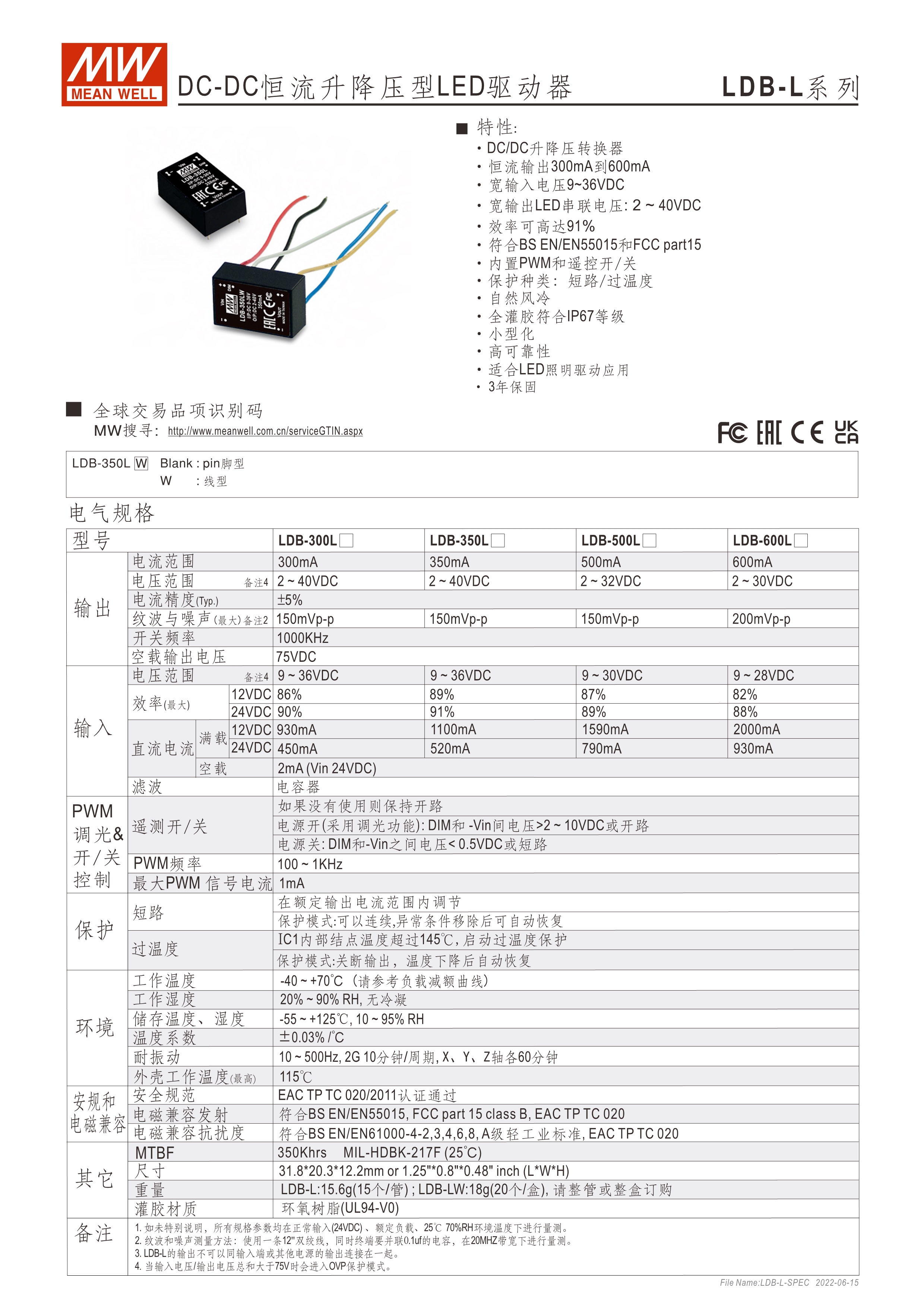 DC/DC升降壓式恒流輸出LED驅動器 91%高效率 不需外接任何組件即可符合EN55015及FCC 具PWM調光及開關遙控功能 適合降壓-升壓型照明系統 (需插件于PCB母板上) 具備插pin及出線兩種型式