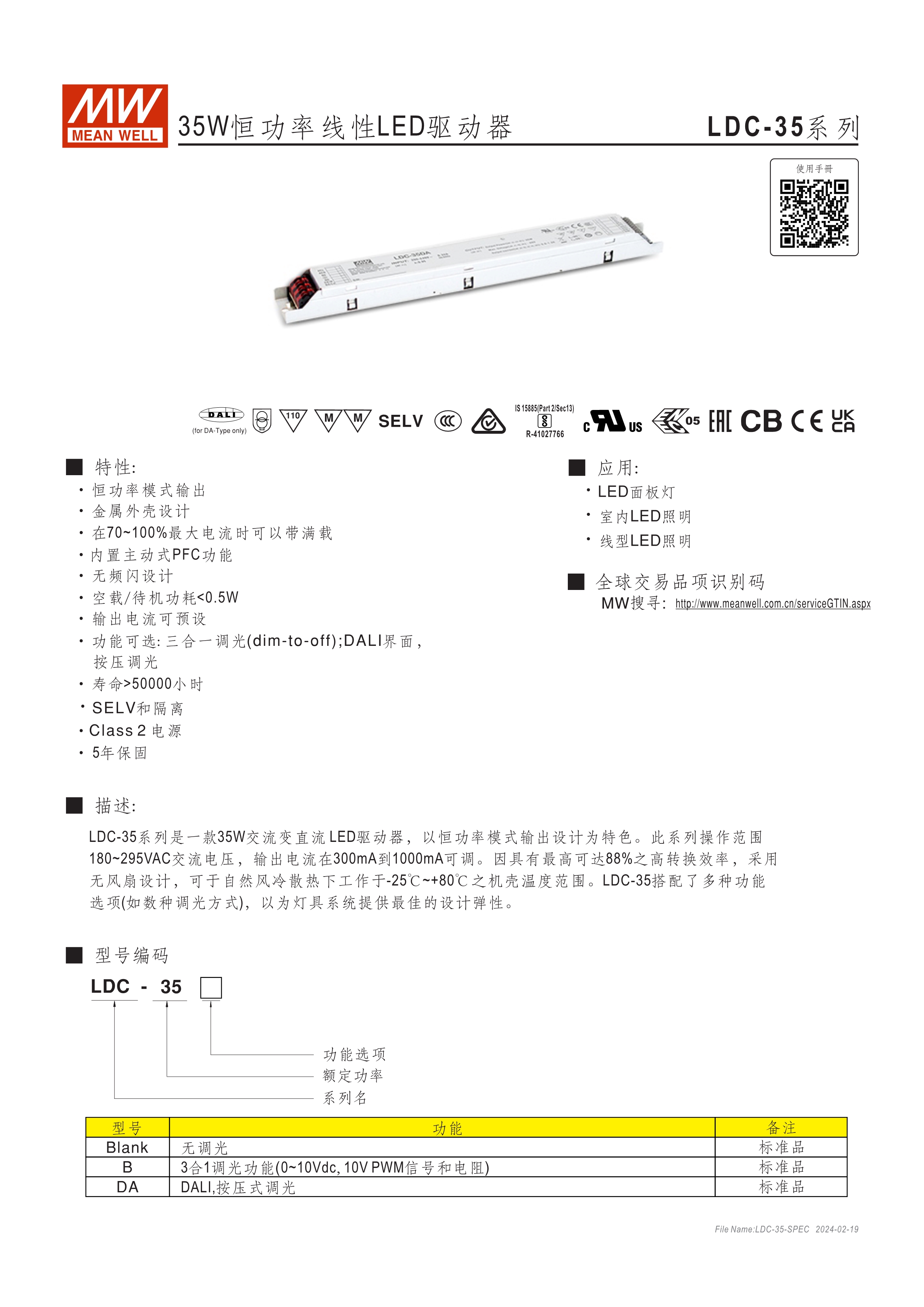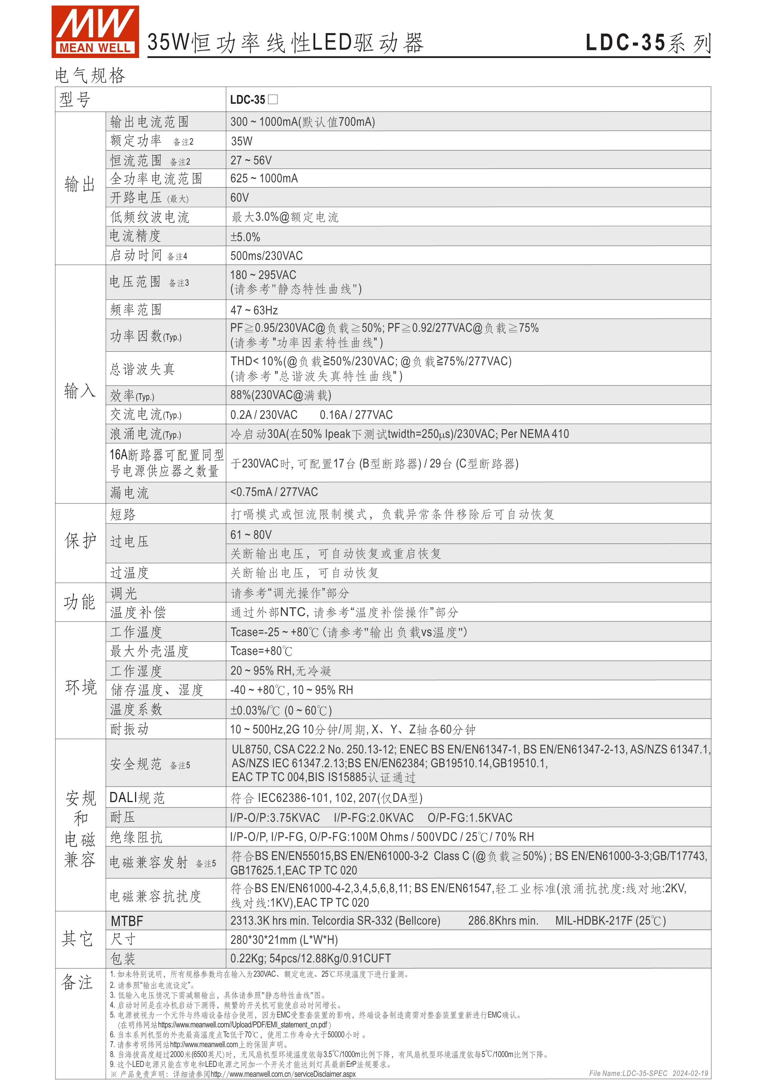 恒功率模式輸出,輸出電流可通過外接電阻設定 無頻閃設計(Fpcker free) 三合一調光功能:0~10Vdc、PMW調光、電阻調光 內建主動式功率因子矯正功能(Active PFC) 低空載功耗: <0.5W 工作溫度: -25~+90℃ 保護種類:短路 UL/ENEC/TUV/CCC/CB/CE 認證齊全 5年保固