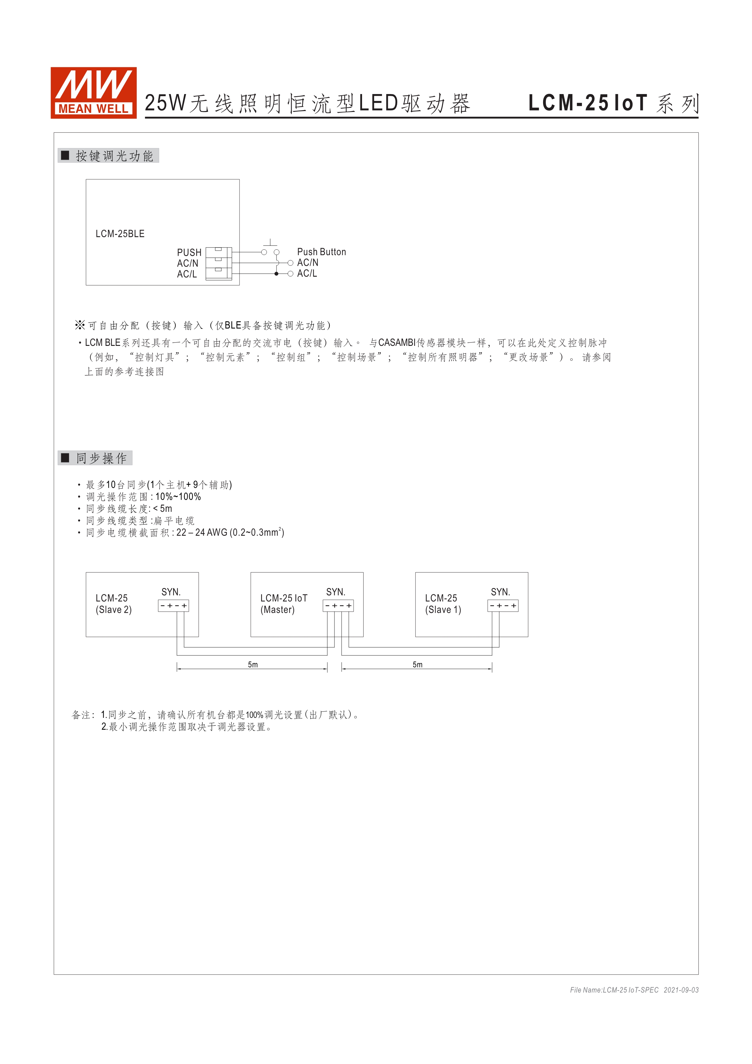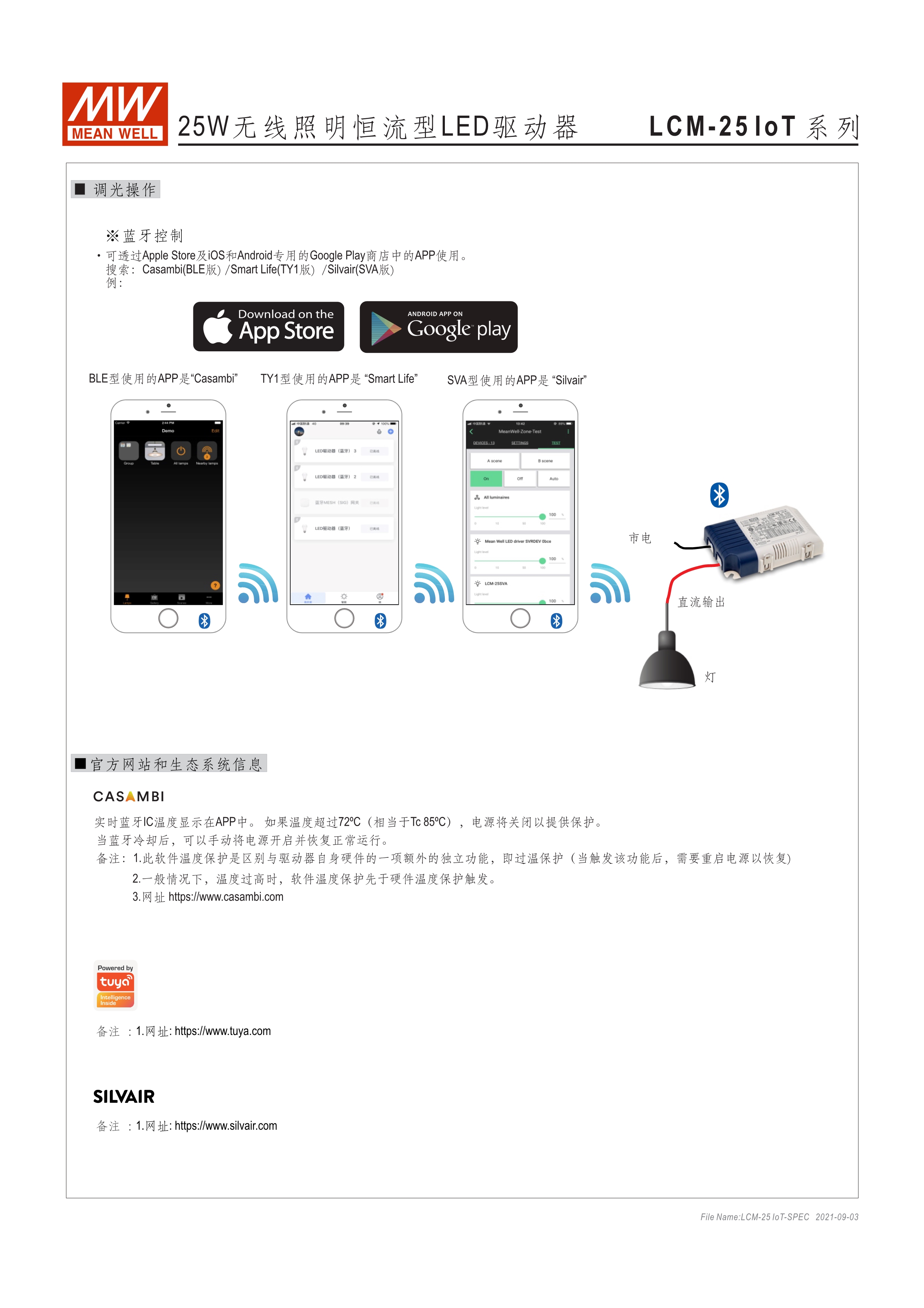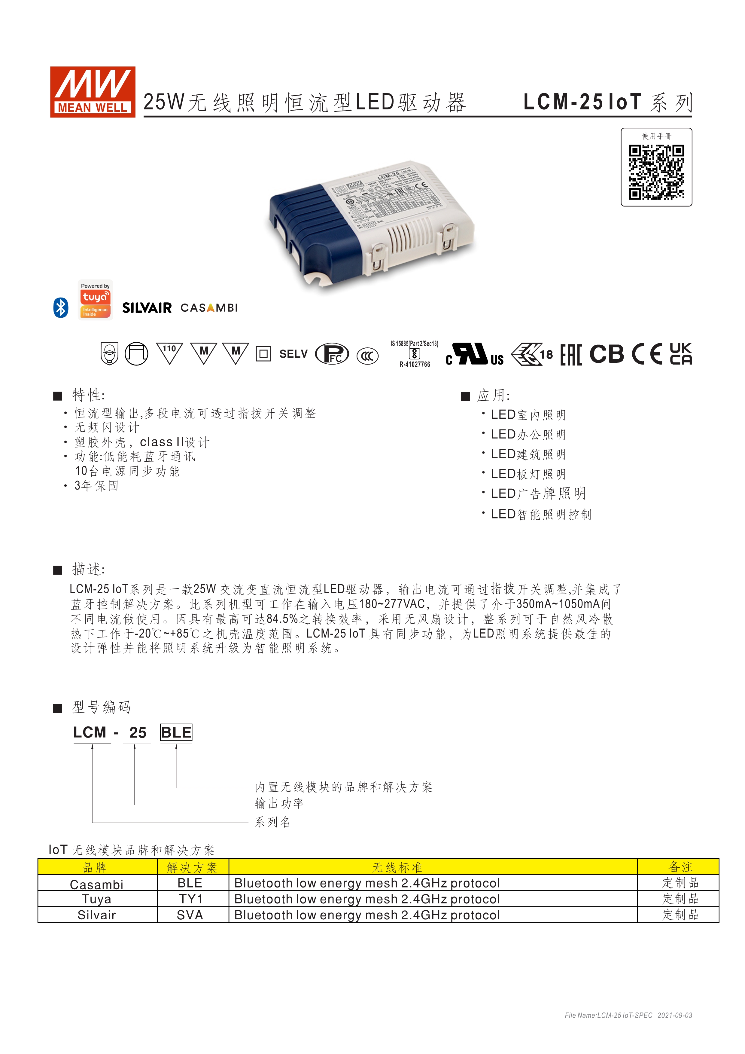 恒流輸出模式多段可選 無頻閃設(shè)計 塑料外殼及符合Class II無地線設(shè)計 主動式PFC設(shè)計 調(diào)光功能:全系列藍芽智能控制及Push Dim(僅LCM系列) 雷擊保護耐壓設(shè)計2KV(L-N) 保護功能:短路、過電壓、過溫度