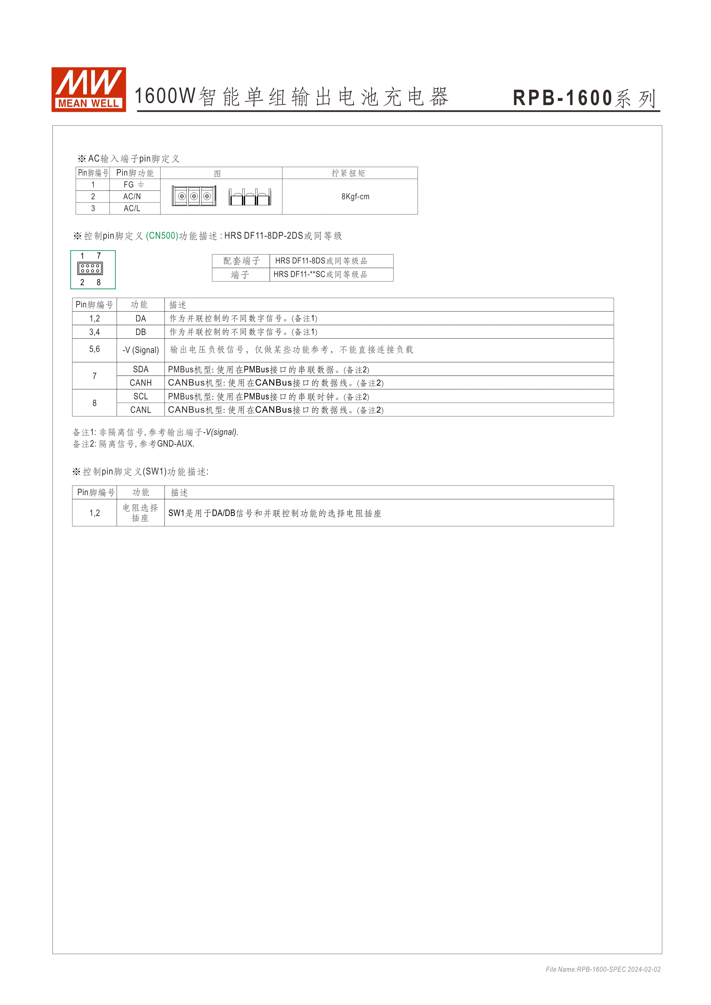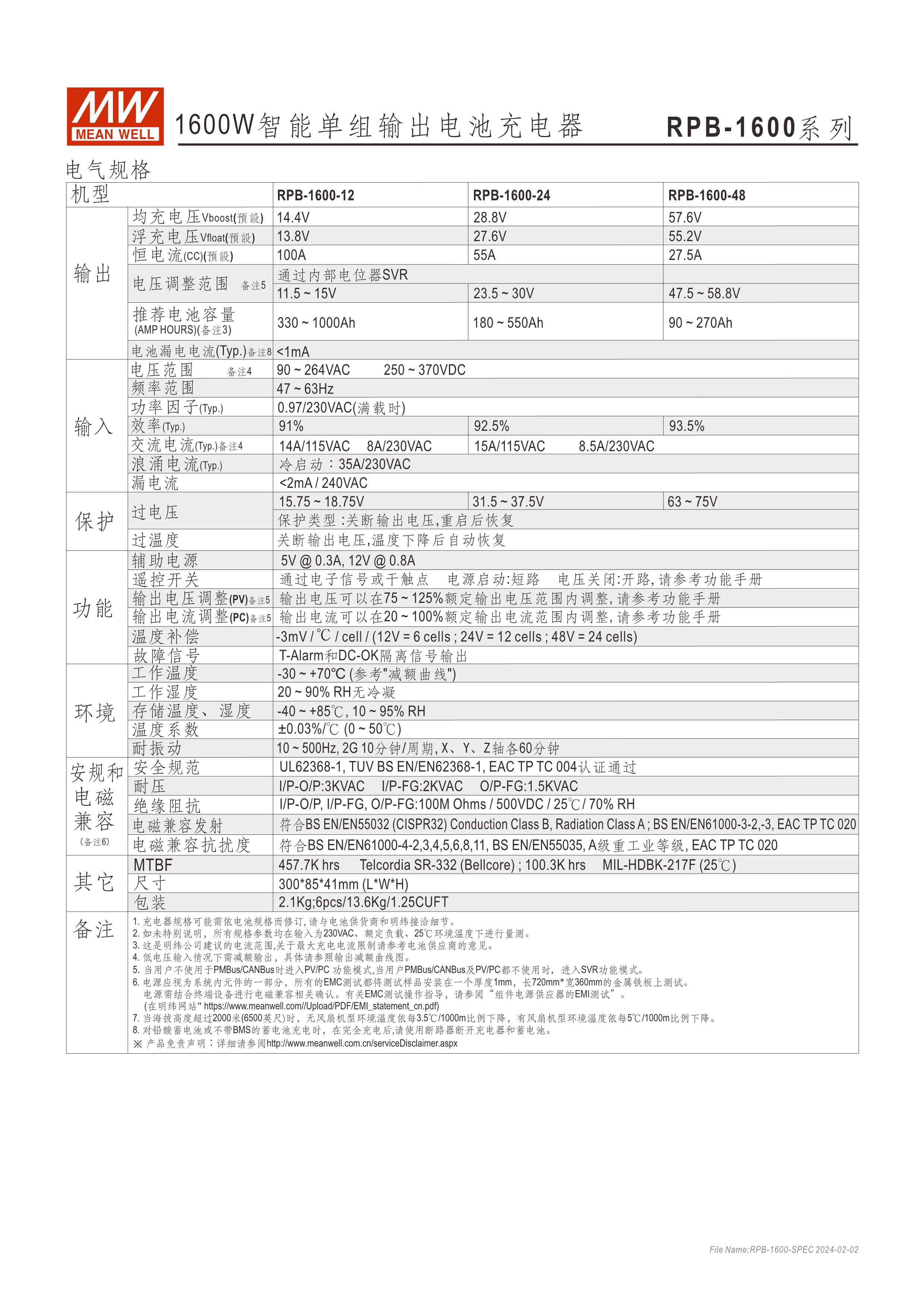 RPB/DBU系列:機(jī)殼型充電器 RCB/DBR系列:Rack機(jī)架型充電器 功率密度高達(dá)37W/in3 內(nèi)建I2C/PMBus通訊介面 (CANBus選購(gòu)) 搭配SBP-001編成器,可設(shè)定充電電壓/電流、2段或3段、停充時(shí)間 透過(guò)外加1~5Vdc,可調(diào)充電電壓75~125% (10.8~18V,21.6~36V, 43.2~72V) 藉由外加1~5Vdc,可調(diào)充電電流20~100% 內(nèi)建OR_ing MOSFET,支援熱插拔 (僅RCB-1600/DBR-3200系列) 均流并聯(lián)最高可達(dá)25600W 保護(hù)功能:電池過(guò)低、未接好、短路、過(guò)溫度 通用鉛酸電池或鋰電池 5年保固