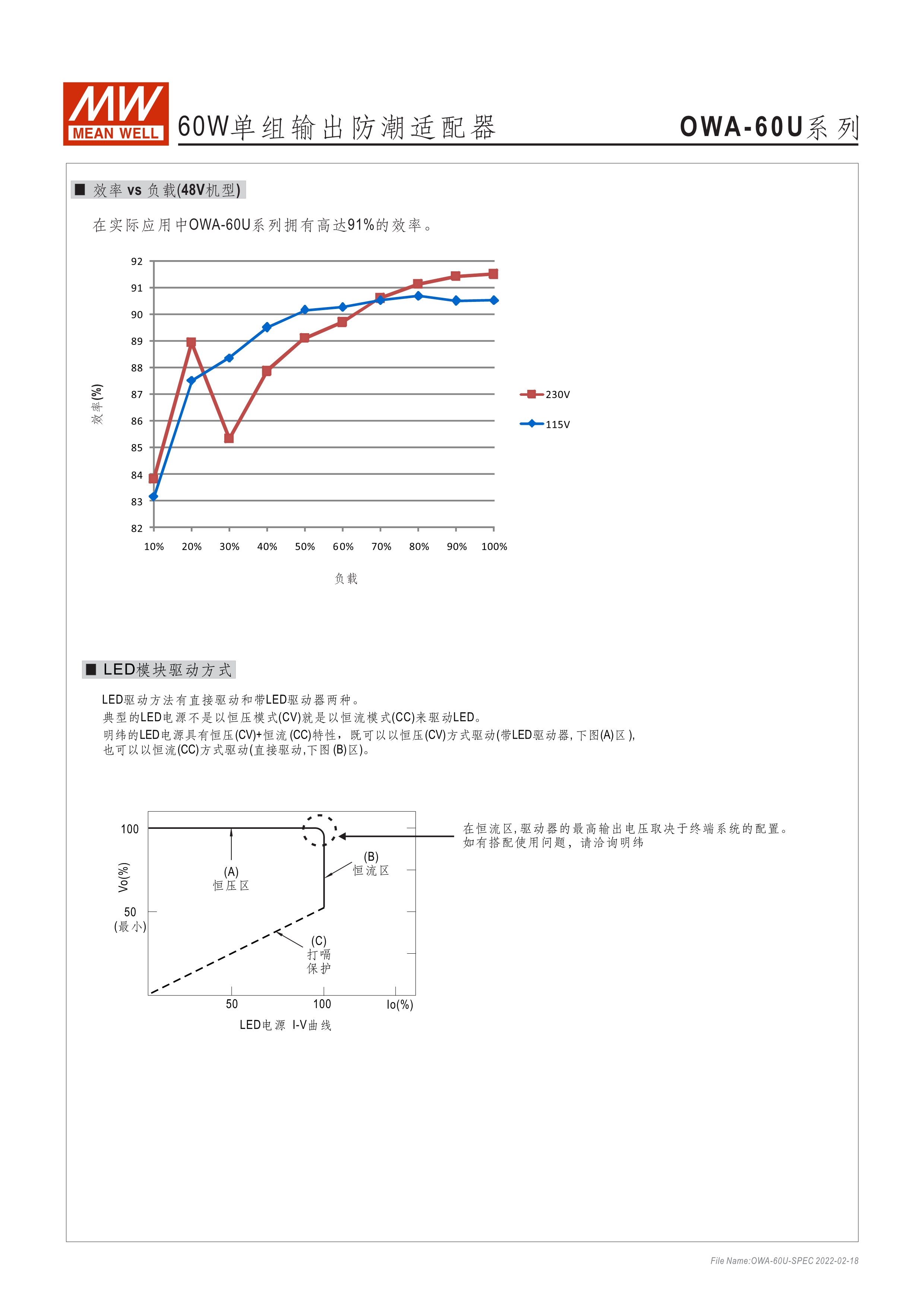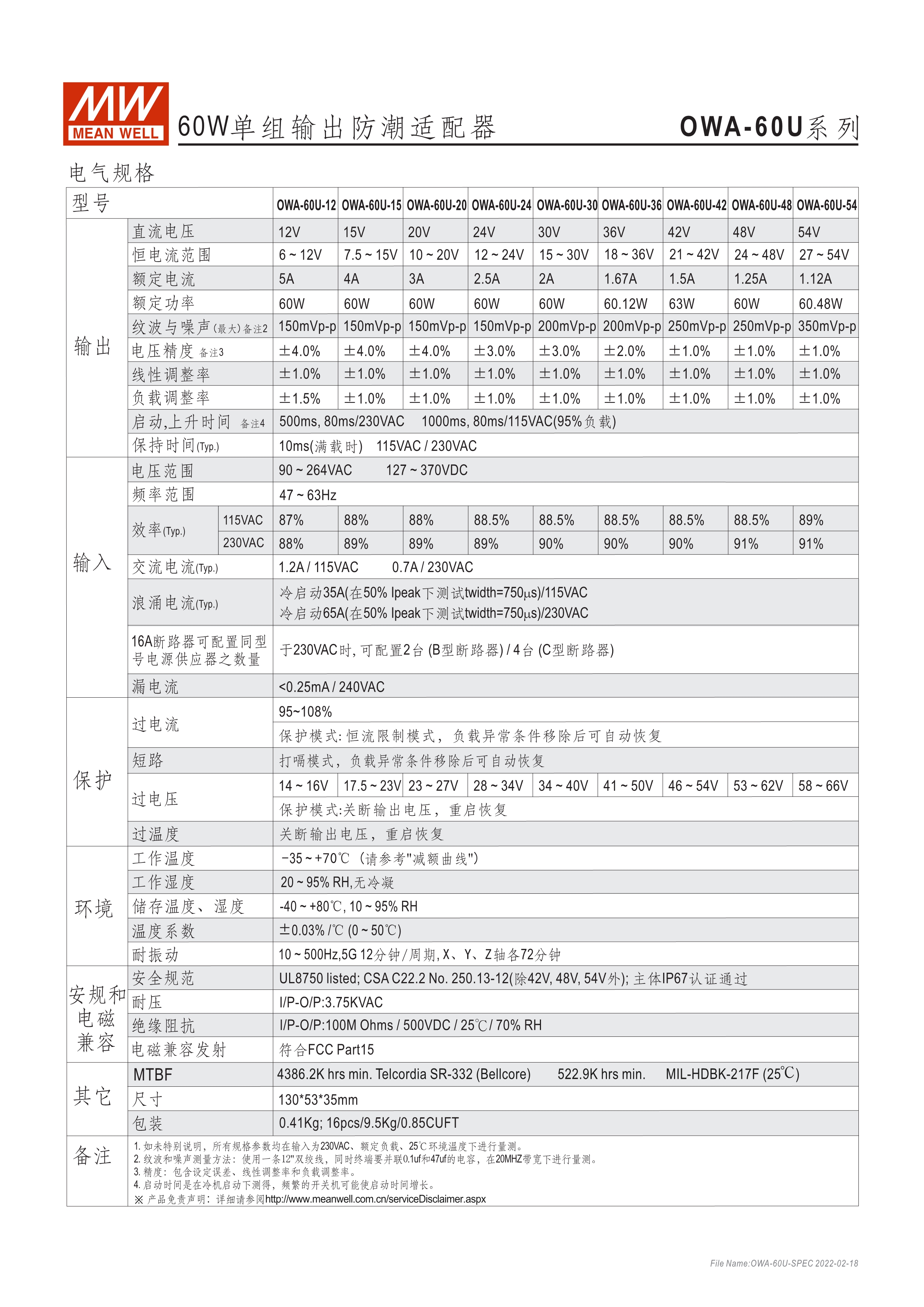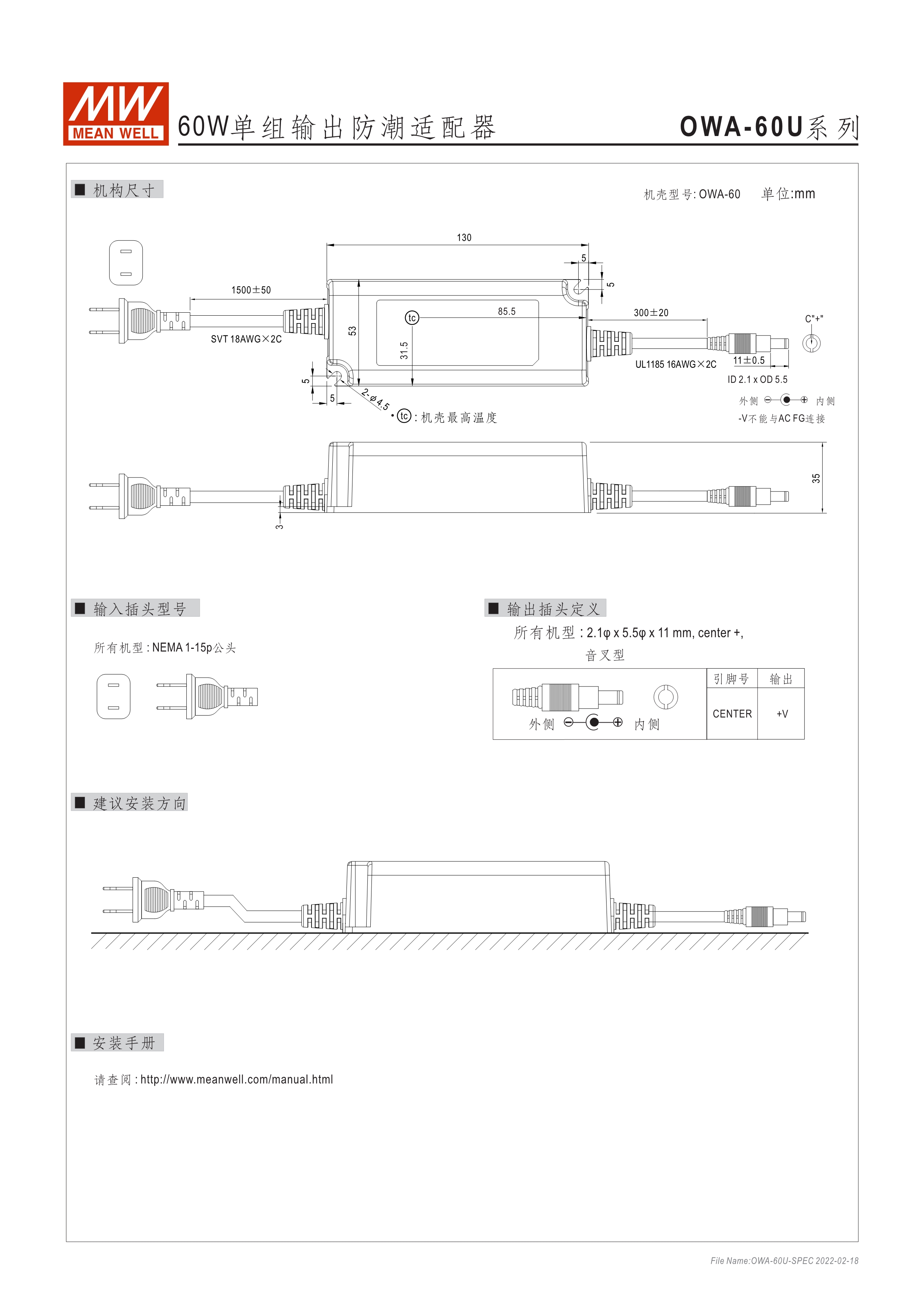 電源主體達(dá)IP67防護(hù)等級(jí) 90~264VAC交流輸入(OWA-120E為180~264VAC交流輸入) 空載損耗<0.15W 能效等級(jí)Level VI E型: 符合EU ErP 及 CoC Version 5 (OWA-120E 僅符合EU ErP) U型: 符合EISA 2007/DoE 及 NRCan Class II電源 (無FG) U型:2極美插,E型:2極歐插 多種DC輸出轉(zhuǎn)接頭可更換 5年保固期