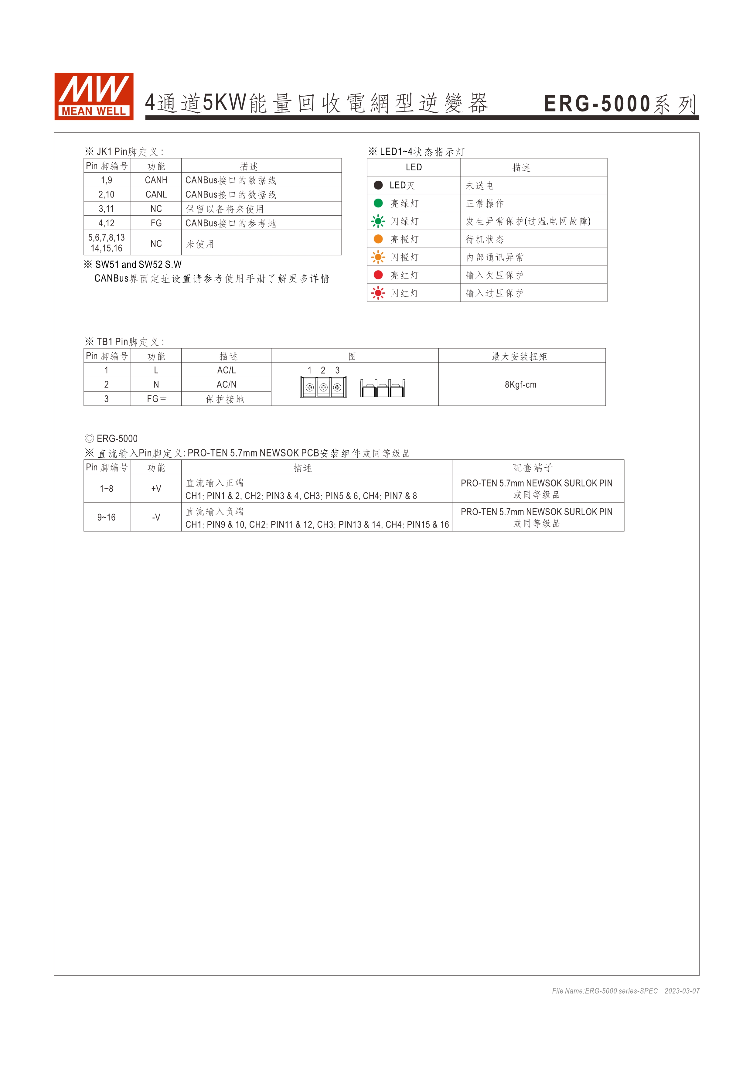系統(tǒng)電源解決方案 (PDF) 寬輸入電壓范圍10~60VDC/寬輸入電壓范圍60~420VDC 效率高達(dá)91% 靈活配置的模塊化設(shè)計(jì) 彈性的CC/CV操作模式 通過(guò)CMU2A實(shí)現(xiàn)CAN總線協(xié)議遠(yuǎn)程控制和監(jiān)控控制 可連接最多64個(gè)ERG-5000系列 保護(hù)功能:過(guò)電壓、欠電壓、過(guò)熱、過(guò)功率、電網(wǎng)故障、過(guò)功率無(wú)輸入、通信錯(cuò)誤 3年保固