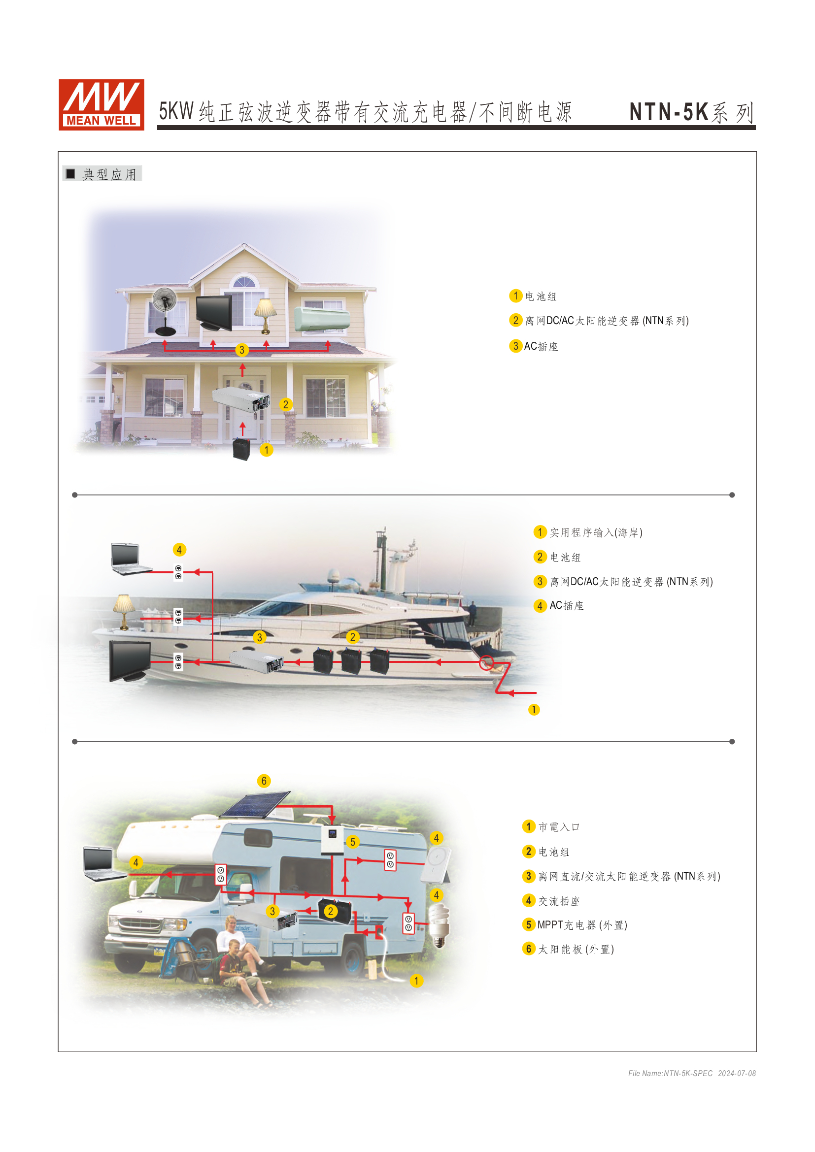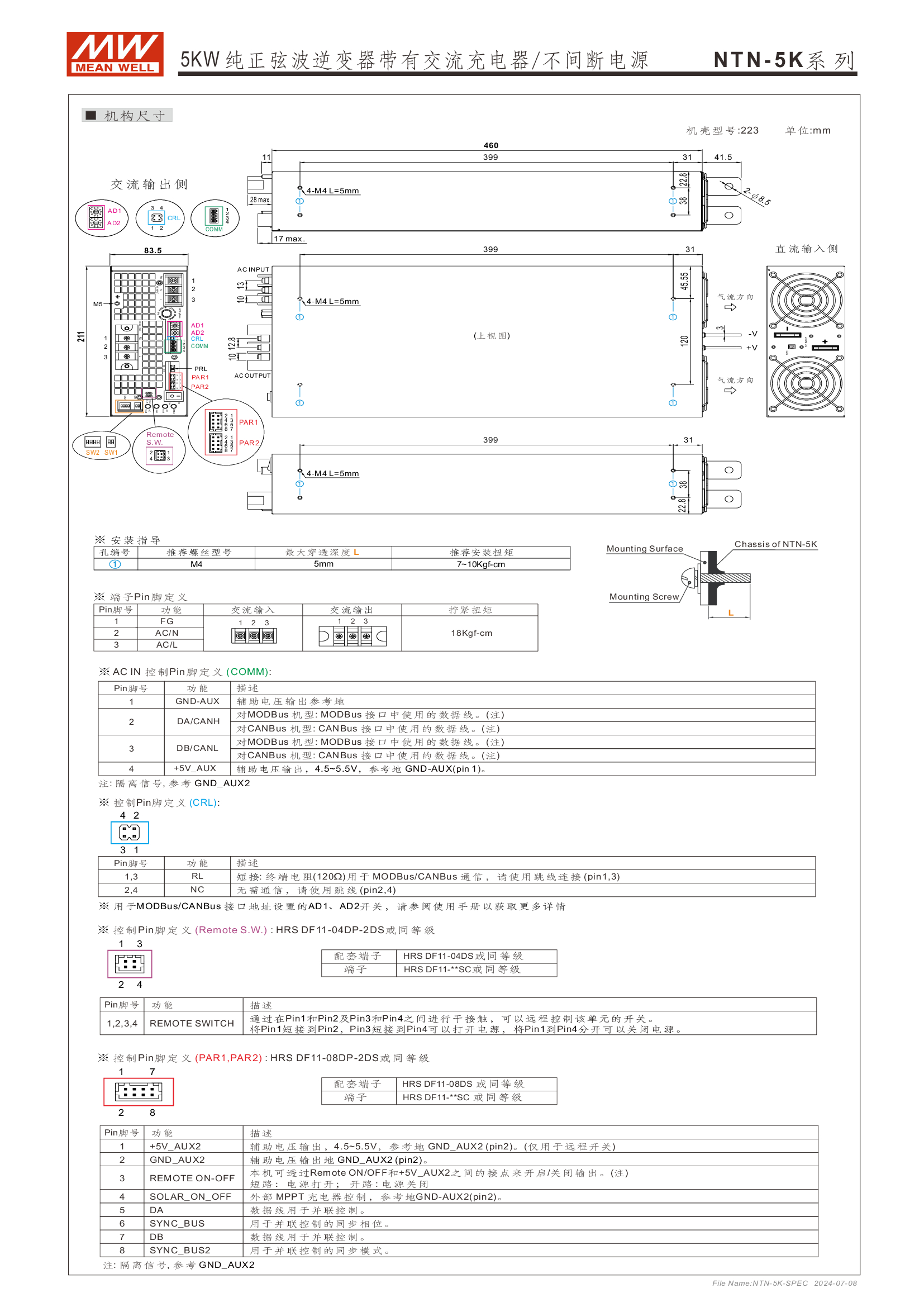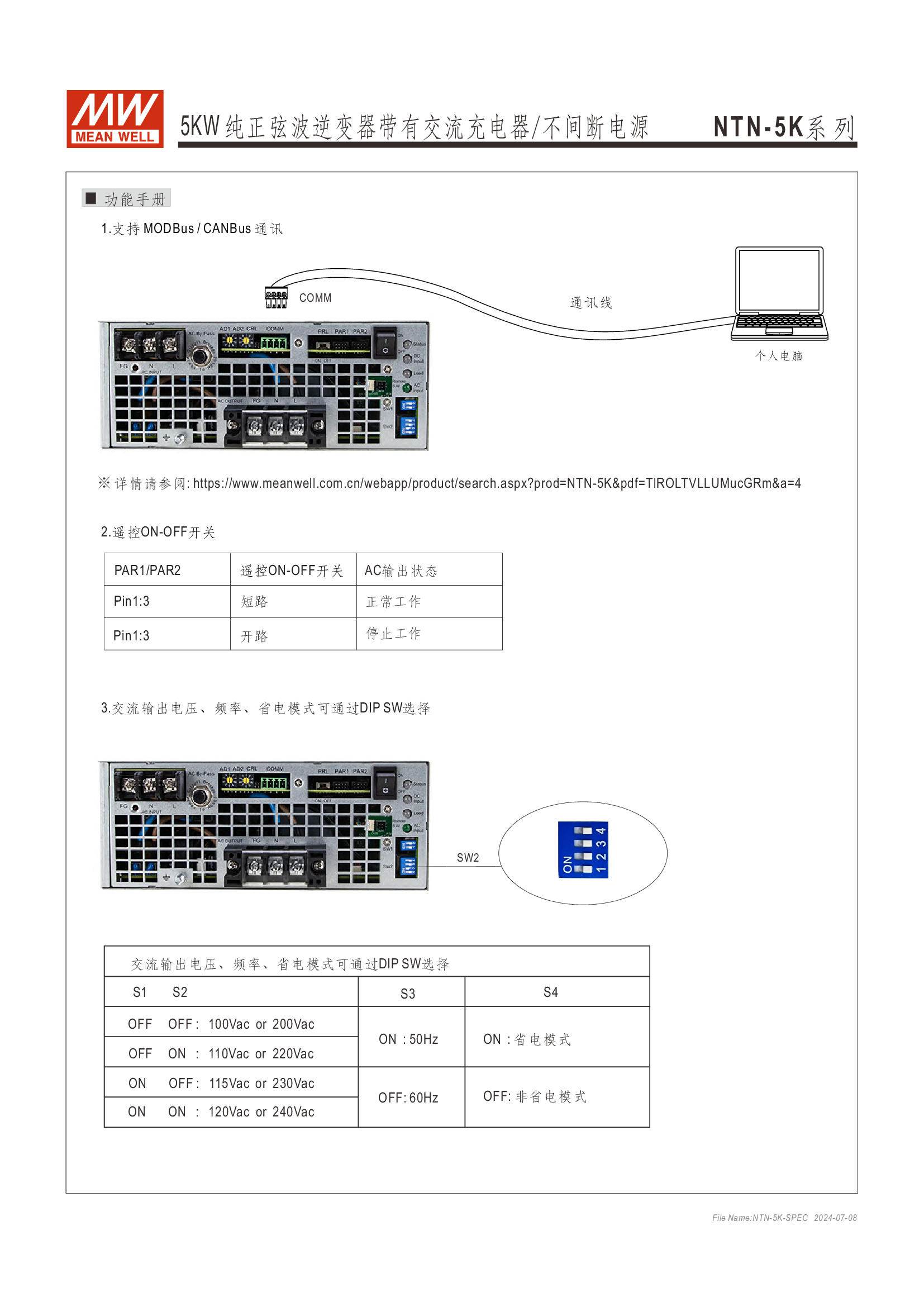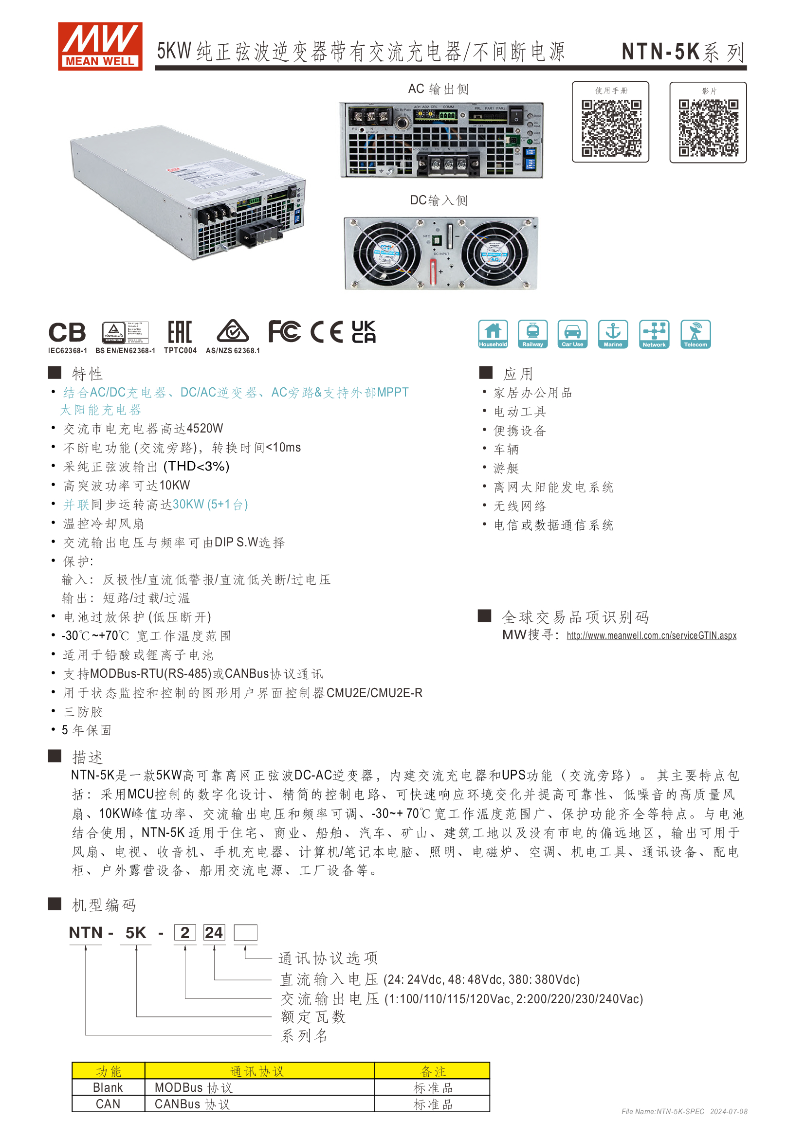 多功能一體機(jī) (AC-DC 充電器 + DC-AC 逆變供載 + AC 旁路供載) AC 市電充電最高可達(dá) 135A /4KW 可提供瞬間功率達(dá) 10KW 并聯(lián)同步運(yùn)行高達(dá) 30KW(5+1 機(jī)組) 多重智能保護(hù)功能: 直流輸入:極性反接/ 低壓告警與關(guān)機(jī)/ 過(guò)壓 /電池過(guò)放電保護(hù) 交流輸出:短路/ 過(guò)載/ 過(guò)溫 內(nèi)建 MODBus 或 CANBus 通訊監(jiān)控 5 年保固