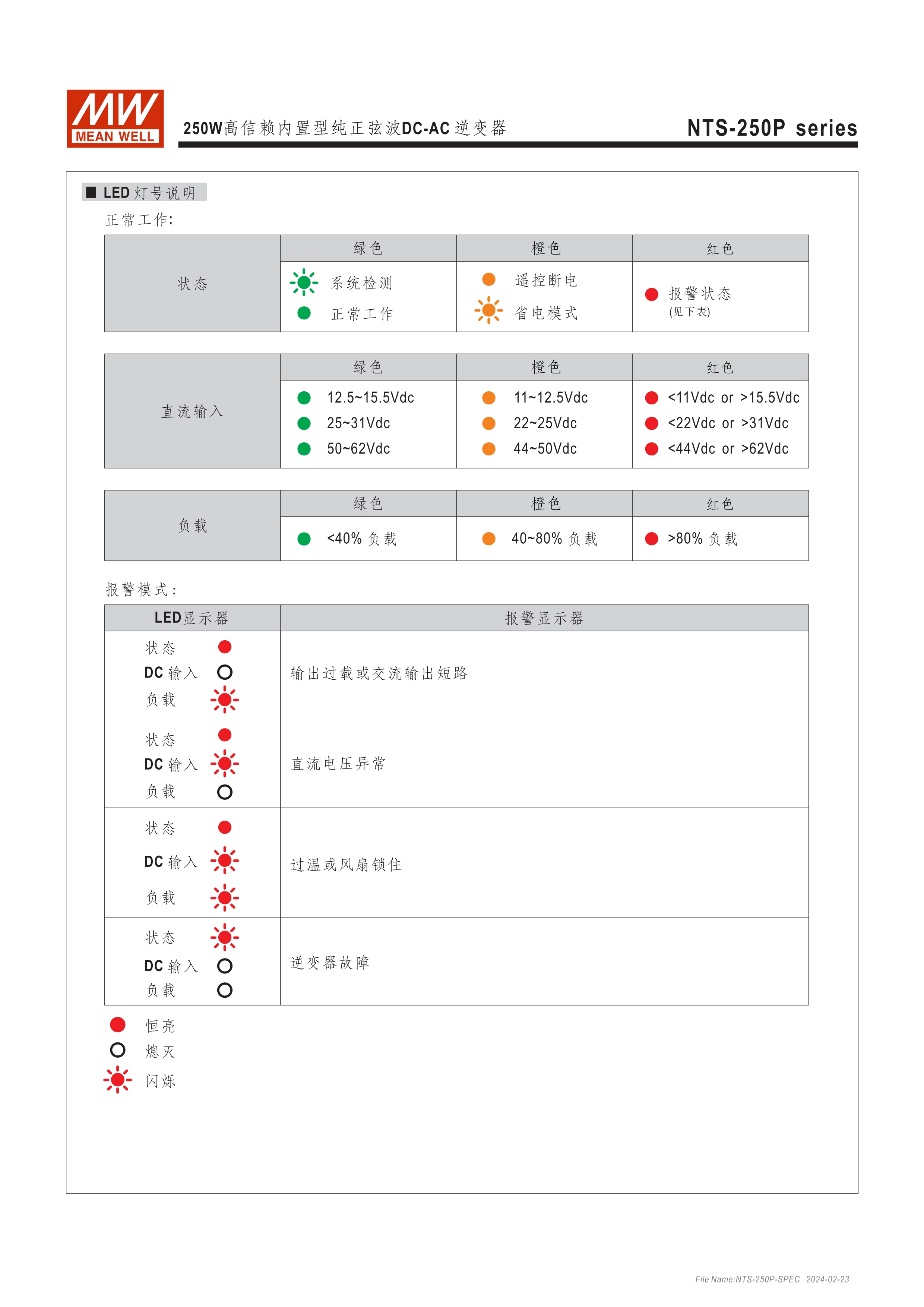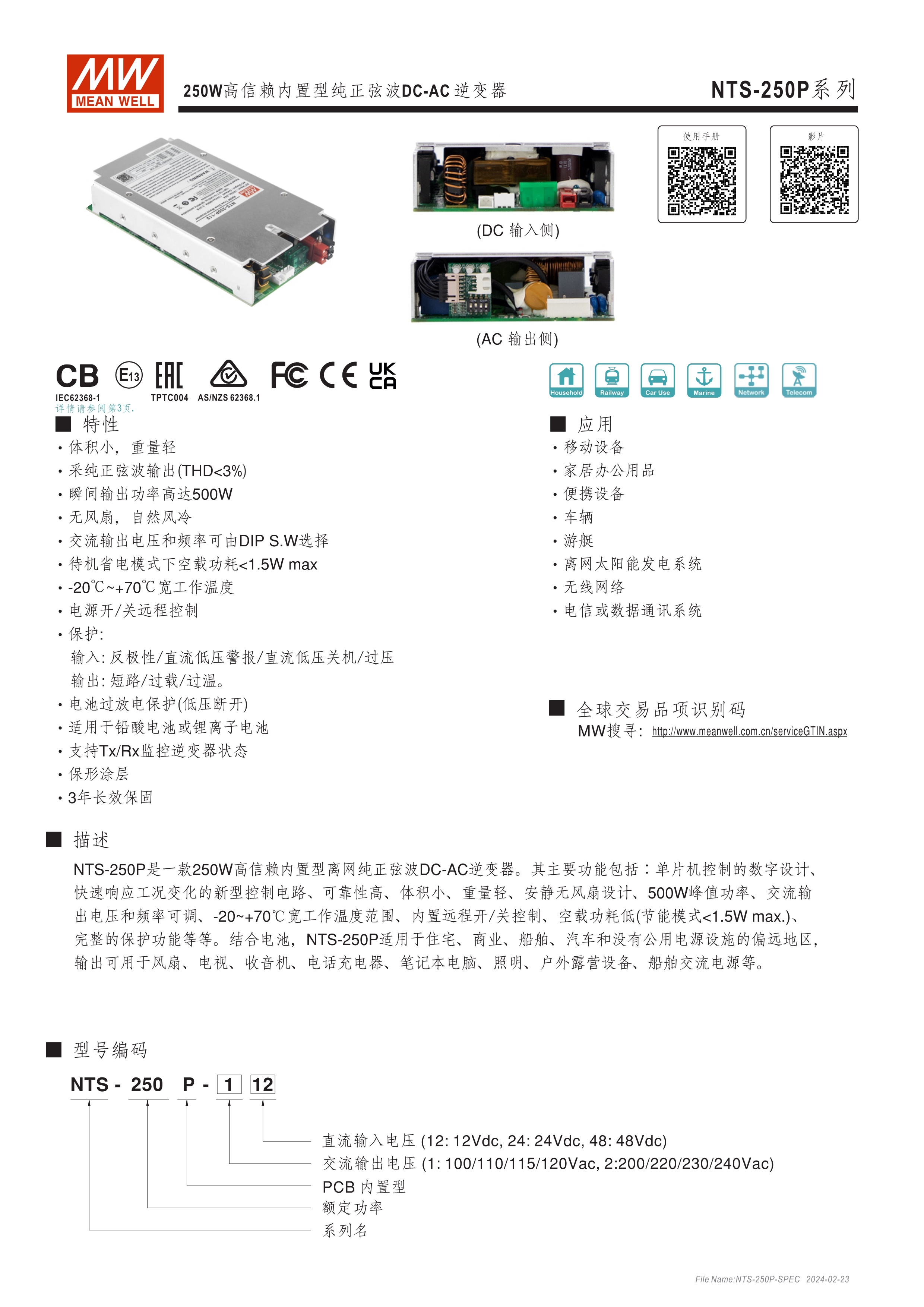 DC-AC純正弦波輸出 (THD<3%) 無風(fēng)扇設(shè)計,效率最高達93%,可自然風(fēng)冷散熱 瞬間峰值功率達雙倍輸出 內(nèi)建DIP S.W可彈性自調(diào)AC輸出電壓、頻率、節(jié)能模式 多重智能保護功能: DC輸入側(cè) - 極性反接、電壓過低、電壓過高保護 AC輸出側(cè) - 短路、超載、過熱保護