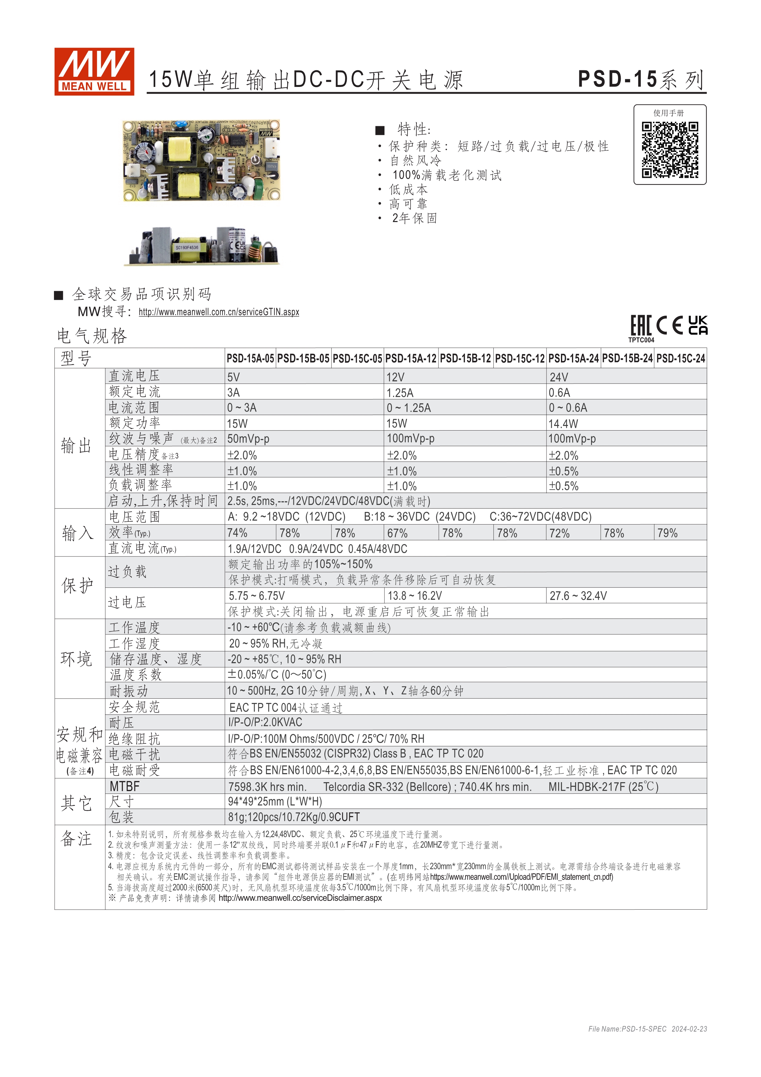 2:1 寬輸入范圍 輸入/輸出隔:1.5~2KVAC (依機(jī)型)