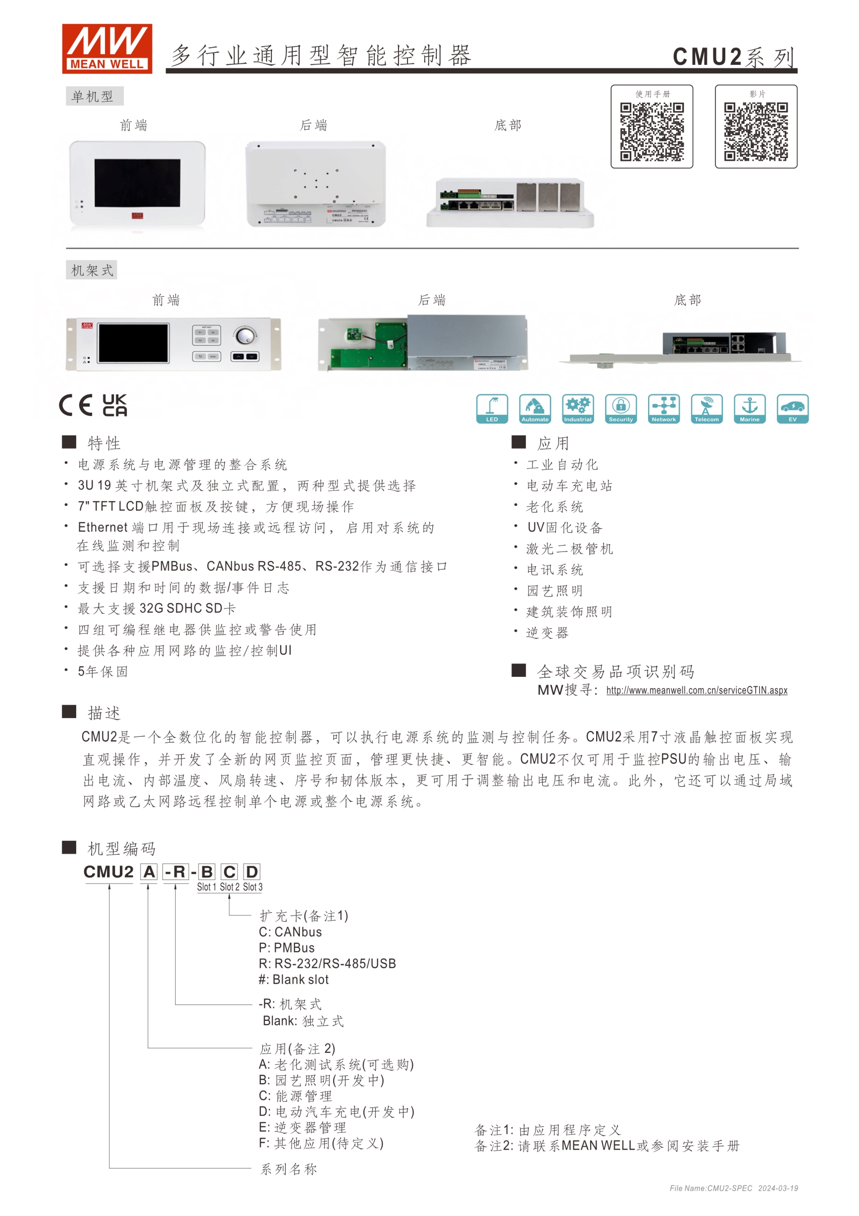 電源系統(tǒng)與電源管理的整合系統(tǒng) 3U 19英吋機(jī)架式及獨立式配置,兩種型式可選擇 7" TFT LCD觸控面板及按鍵,方便現(xiàn)場操作 Ethernet端口用于現(xiàn)場連接,或遠(yuǎn)程訪問,啟用對系統(tǒng)的在線監(jiān)測和控制 可選擇支援PMBus CANbus, RS-485, RS-232作為通信接口 提供各種應(yīng)用網(wǎng)路的監(jiān)控、控制UI