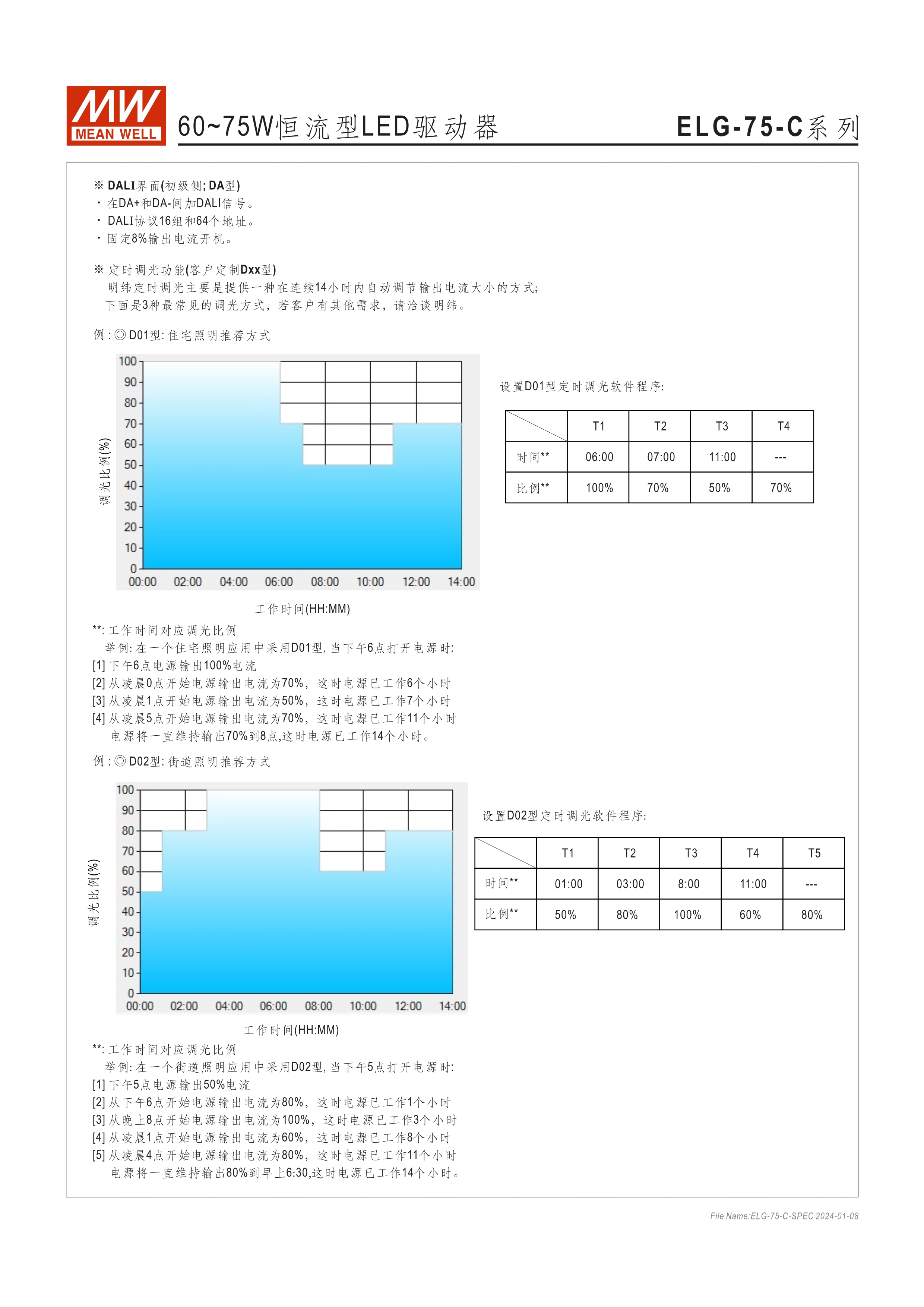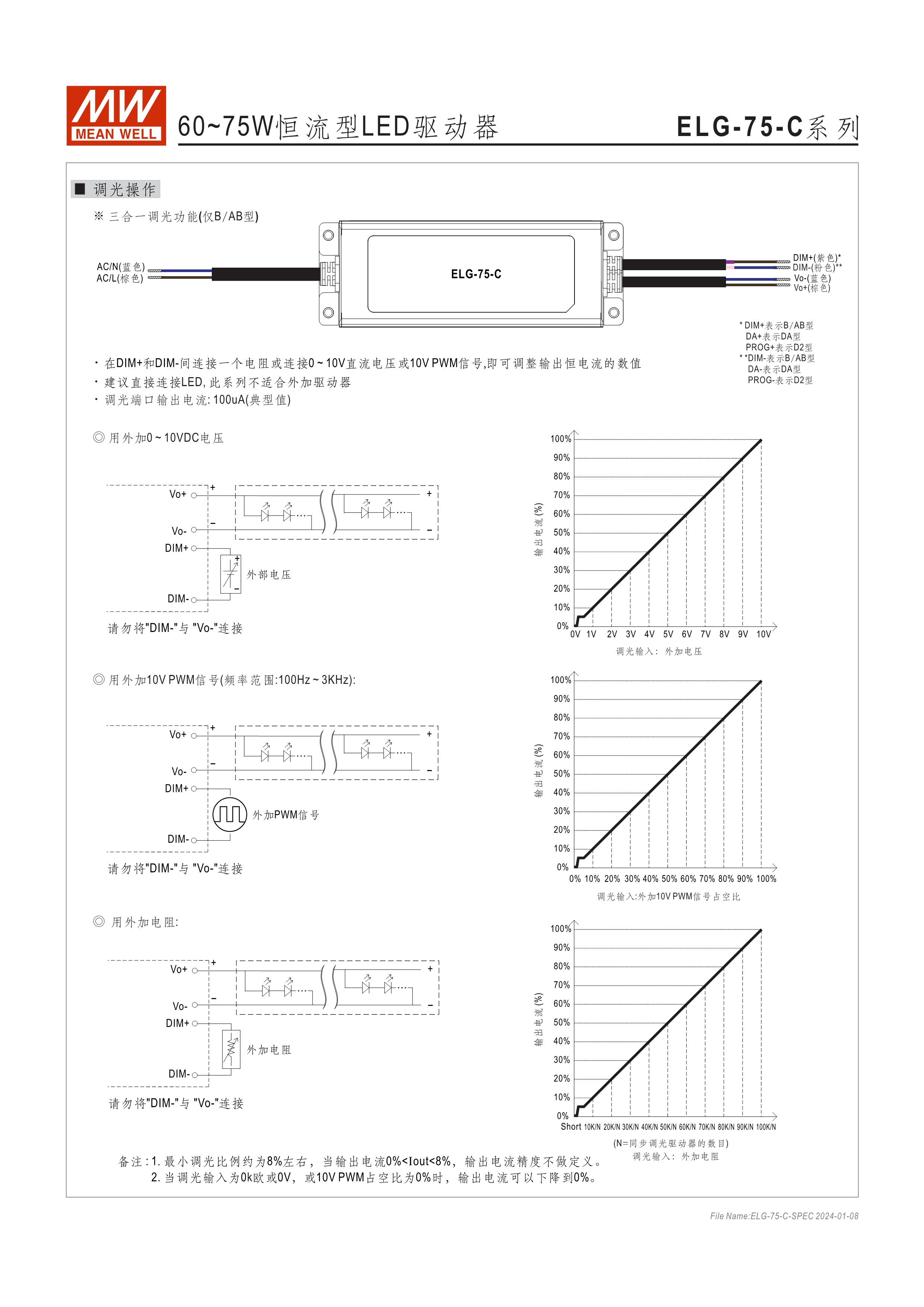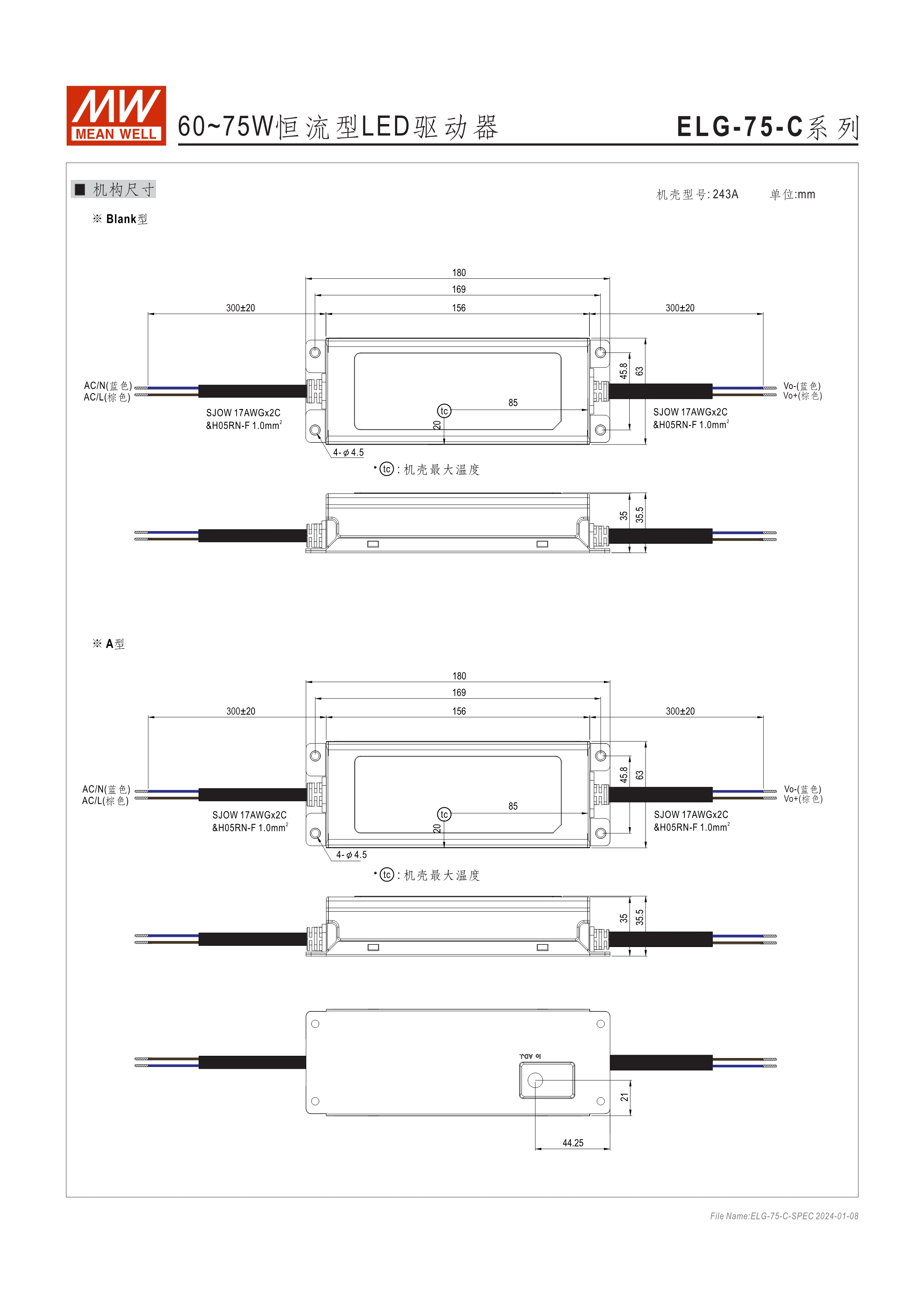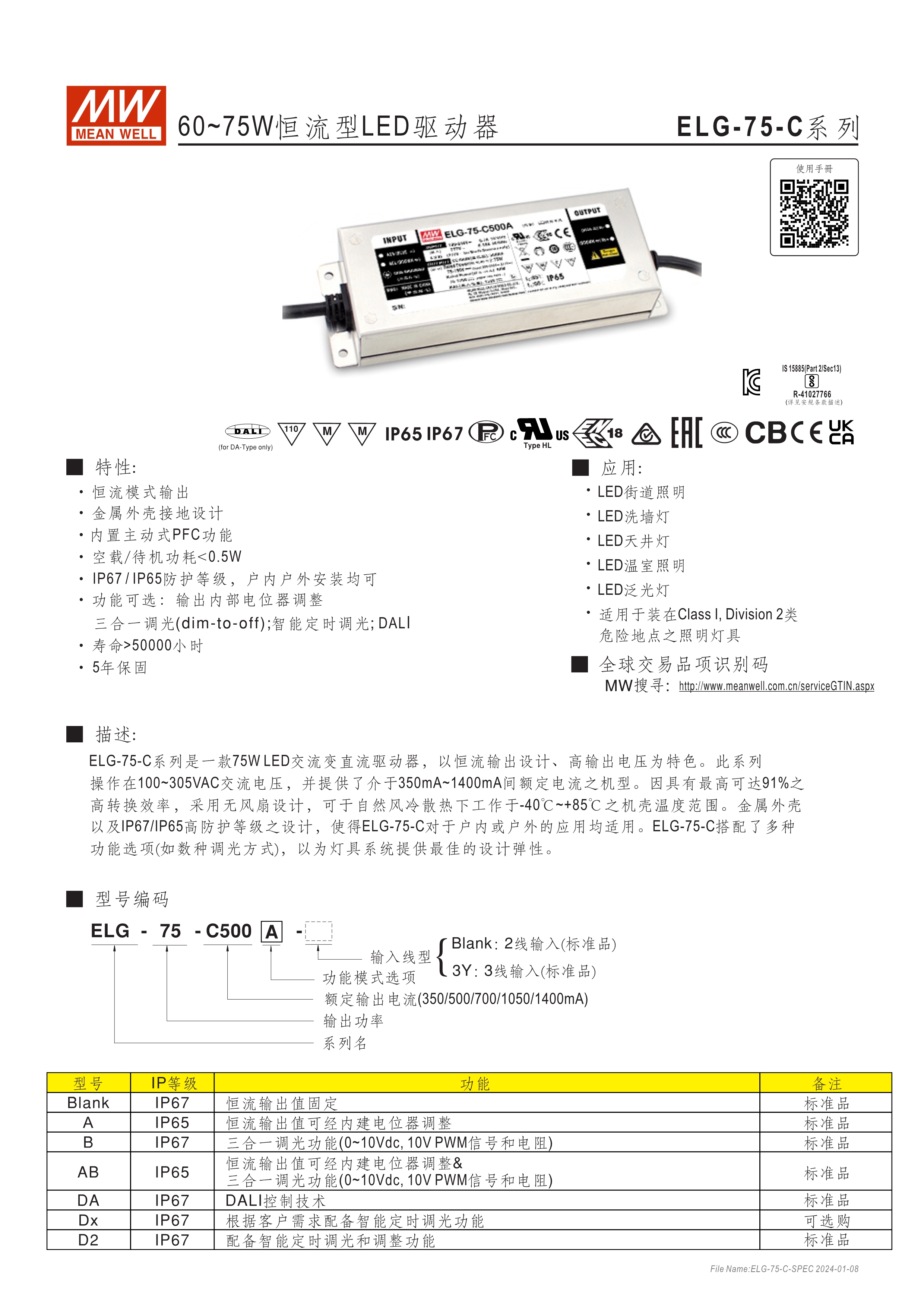 輸入范圍100~305VAC 恒流輸出機種 恒功率輸出機種(ELGC-300) 內置主動式PFC功能 空載/待機消耗<0.5W 金屬外殼,IP67/IP65防護等級可用于戶外與室內 功能選項 : 輸出可經(jīng)由電位器調整;三合一調光(0~10Vdc或10V PWM信號或電阻,可關斷);智能定時調光;DALI;輔助直流輸出(ELG-150-C BE-Type) Type "HL" LED電源適用在安裝于Class I, Division 2 類 危險地點之照明燈具 適合于LED路燈及戶外LED照明等應用 5年保固期