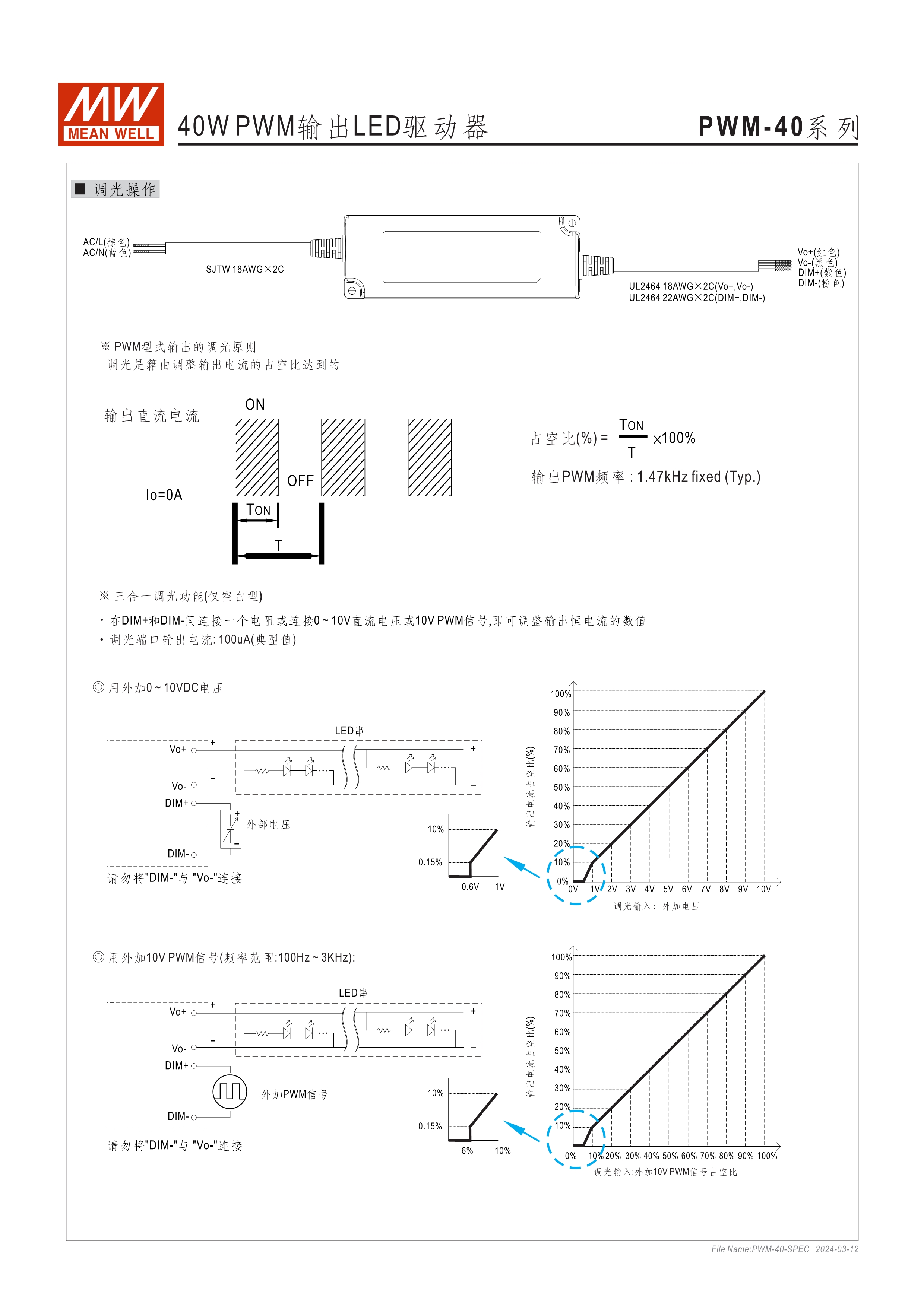 90~305VAC交流輸入, 內(nèi)建主動式功率因子矯正功能(active PFC) 塑料外殼,IP67防護(hù)等級 恒壓PWM輸出 Class II設(shè)計(jì),無FG 空載待機(jī)消耗瓦數(shù)<0.5W 內(nèi)建三合一調(diào)光功能(0~10VDC, PWM信號或電阻,可關(guān)斷) 5年保固期