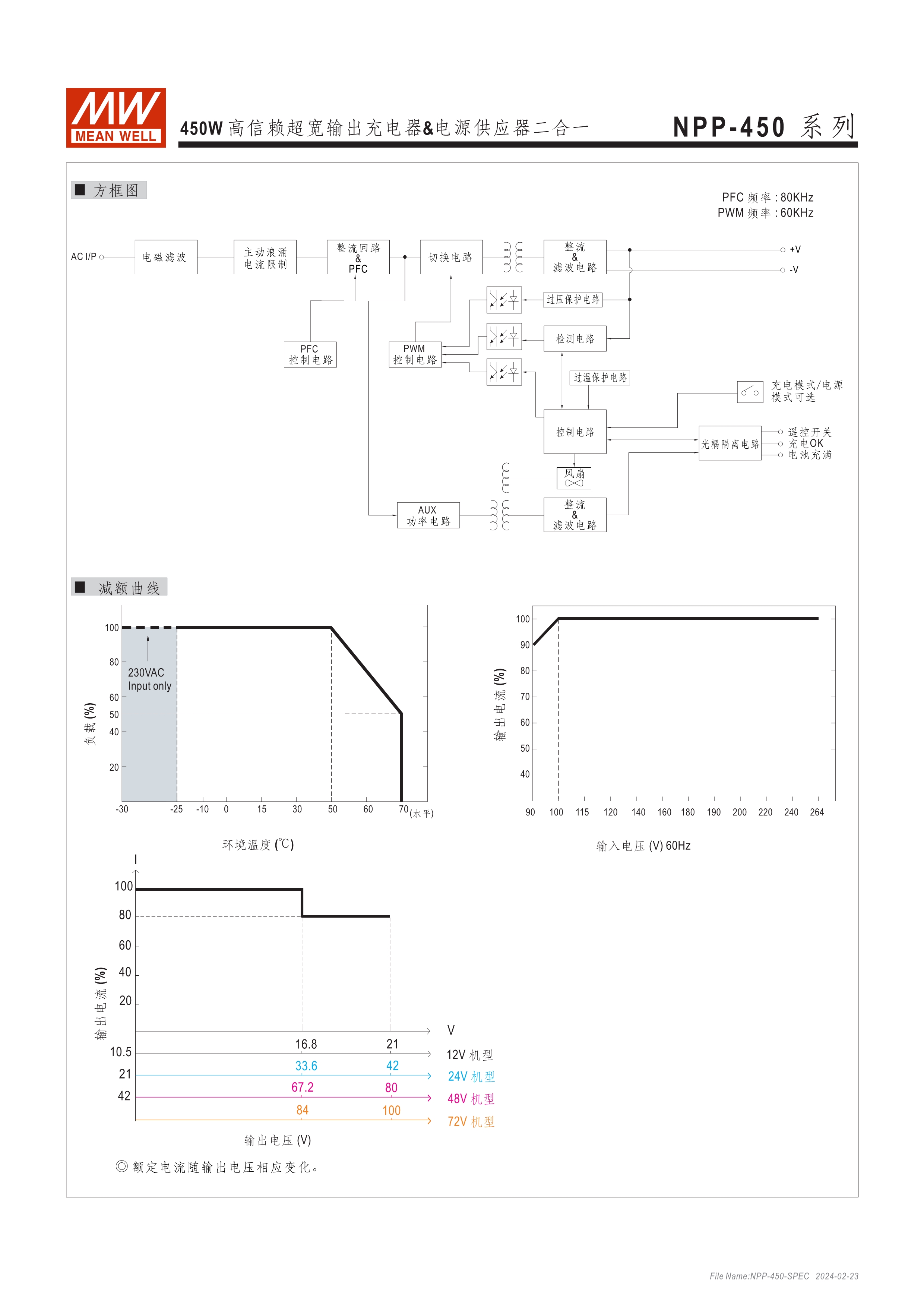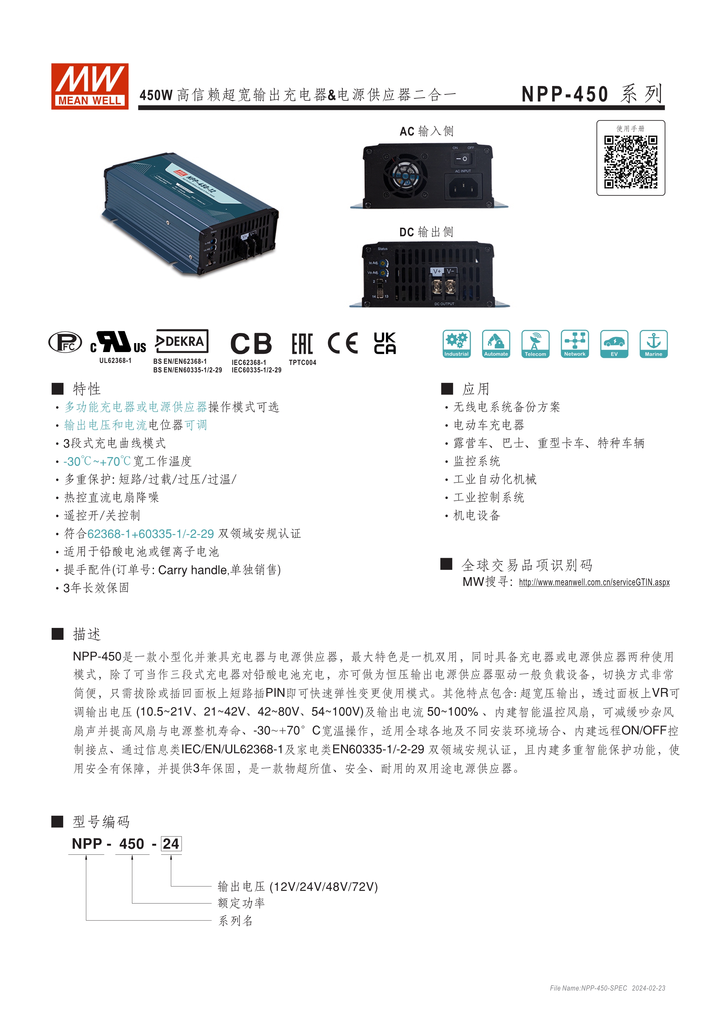 可彈性切換充電器或電源供應(yīng)器 3段式充電,僅適用鉛酸電池 可調(diào)輸出電壓 [由面板VR可調(diào)整10.5~21V, 21~42V, 42~80V, 54~100V(僅NPB-450)] 可調(diào)輸出電流 (由面板VR調(diào)整50~100%) -30~+70oC寬溫度,使用環(huán)境受限少 保護(hù)功能:短路、過壓、過溫度 可另購(gòu)手提把手 (Order No.: Carry Handle) 通過UL/EN62368-1、IEC/EN62368-1/-2-29雙安規(guī)認(rèn)證 3年保固