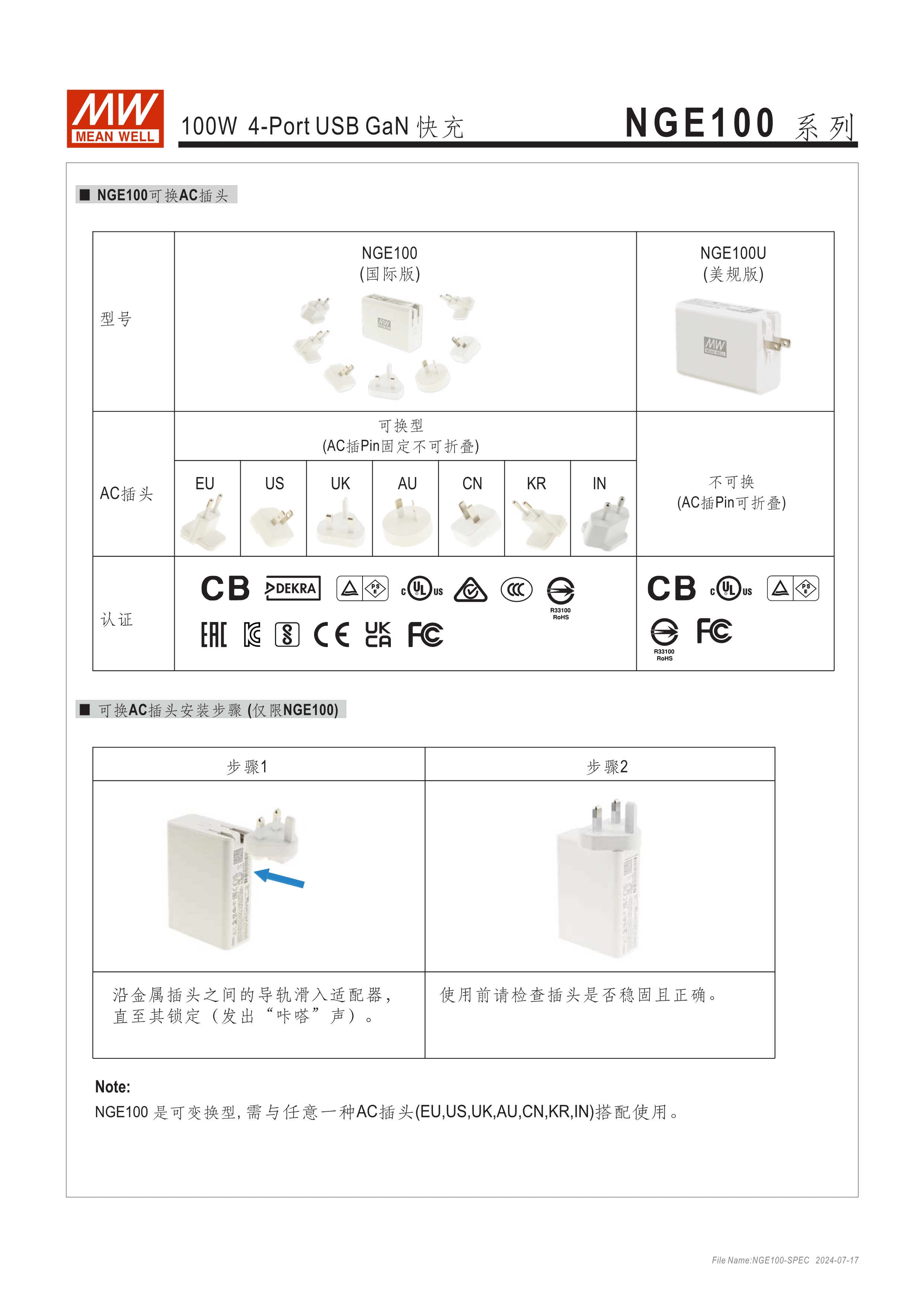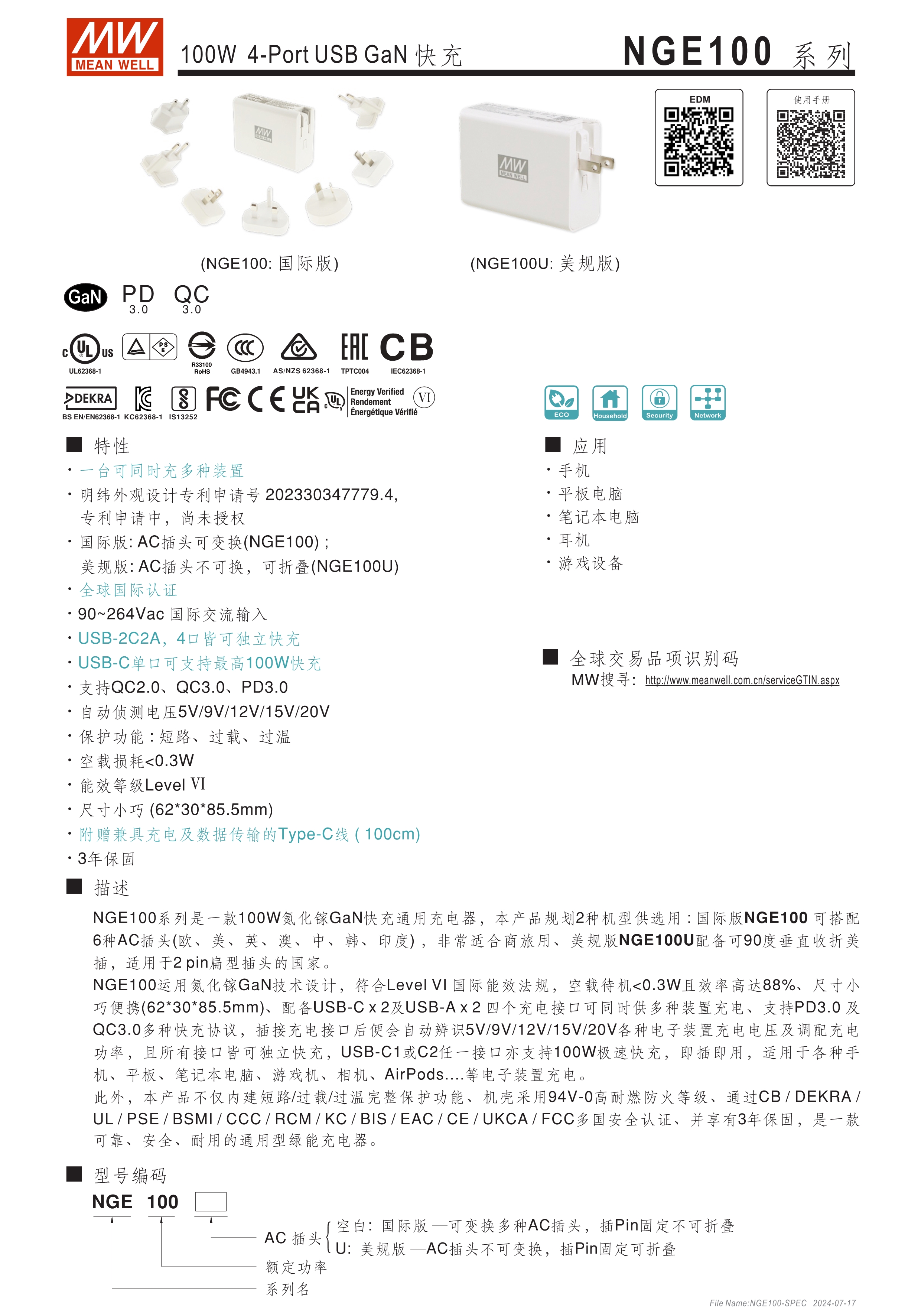 一臺(tái)可同時(shí)充多種裝置 國(guó)際版: AC插頭可變換(NGE100); 美規(guī)版: AC插頭不可換,可折疊(NGE100U) 全球國(guó)際認(rèn)證 USB-2C2A,4-Port皆可獨(dú)立快充 USB-C單port可支援最高100W快充 支援QC2.0、QC3.0、PD3.0 自動(dòng)偵測(cè)電壓:5V/ 9V/ 12V/ 15V/ 20V 保護(hù)功能 : 短路、過(guò)載、過(guò)溫 空載損耗<0.3W 能效等級(jí)Level VI 尺寸小巧 (62x 30x 85.5mm) 附贈(zèng)兼具充電及資料傳輸?shù)腡ype-C線 (100cm) 3年保固
