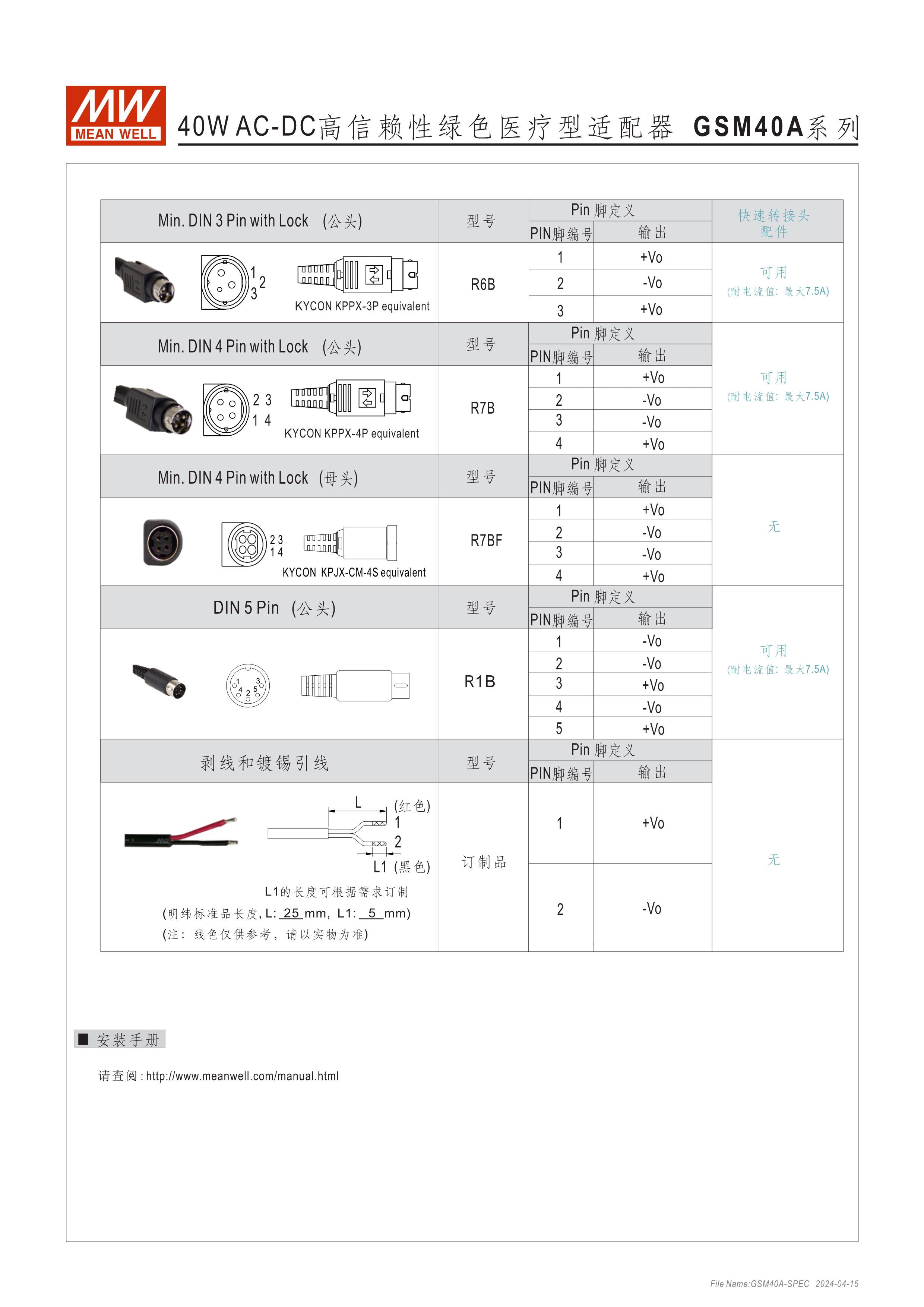 通過醫(yī)療60601-1認(rèn)證(2xMOPP),BF應(yīng)用(僅B型) 能效 VI 級 空載損耗<0.1W~0.15W 符合EISA/DoE、NRCan、ErP 及CoC Version 5 A型:Class I 電源(有接地PIN),IEC 320-C14接口 B型:Class II 電源(無接地PIN),IEC 320-C8接口 極端漏電流<50~175uA(依型號) -30~+70℃工作溫度 多種DC輸出轉(zhuǎn)接頭可更換 3年保固