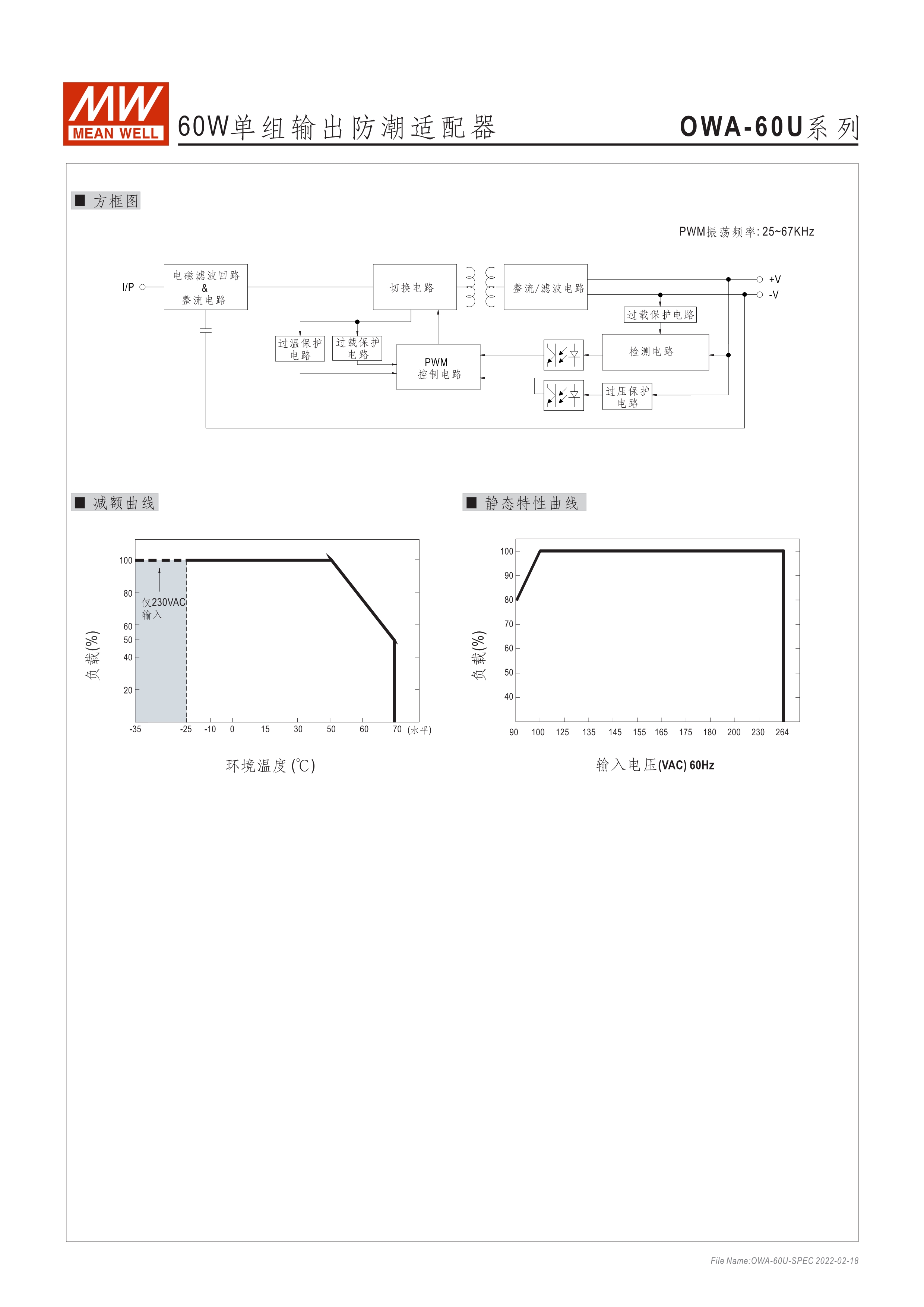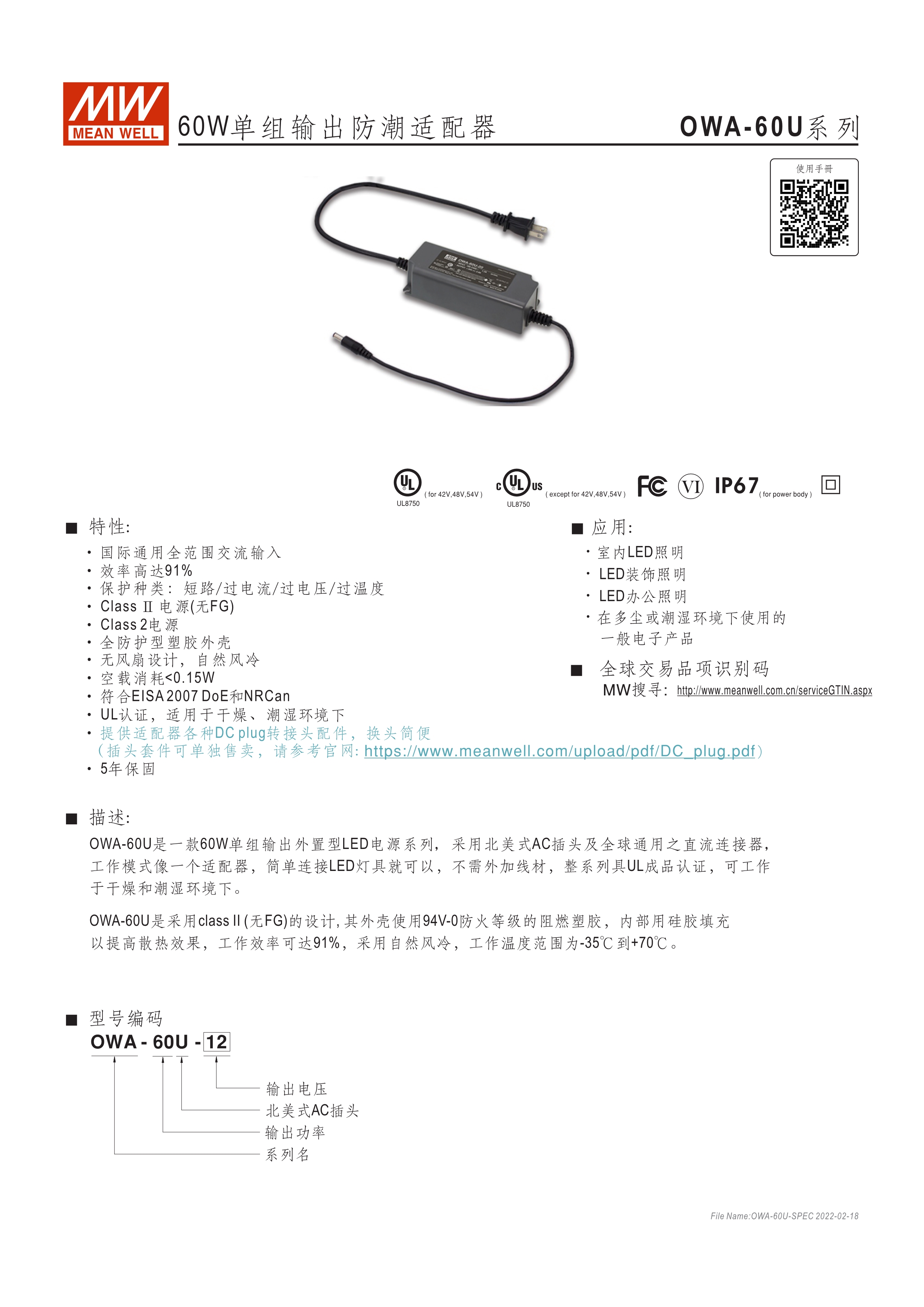 電源主體達(dá)IP67防護(hù)等級(jí) 90~264VAC交流輸入(OWA-120E為180~264VAC交流輸入) 空載損耗<0.15W 能效等級(jí)Level VI E型: 符合EU ErP 及 CoC Version 5 (OWA-120E 僅符合EU ErP) U型: 符合EISA 2007/DoE 及 NRCan Class II電源 (無FG) U型:2極美插,E型:2極歐插 多種DC輸出轉(zhuǎn)接頭可更換 5年保固期