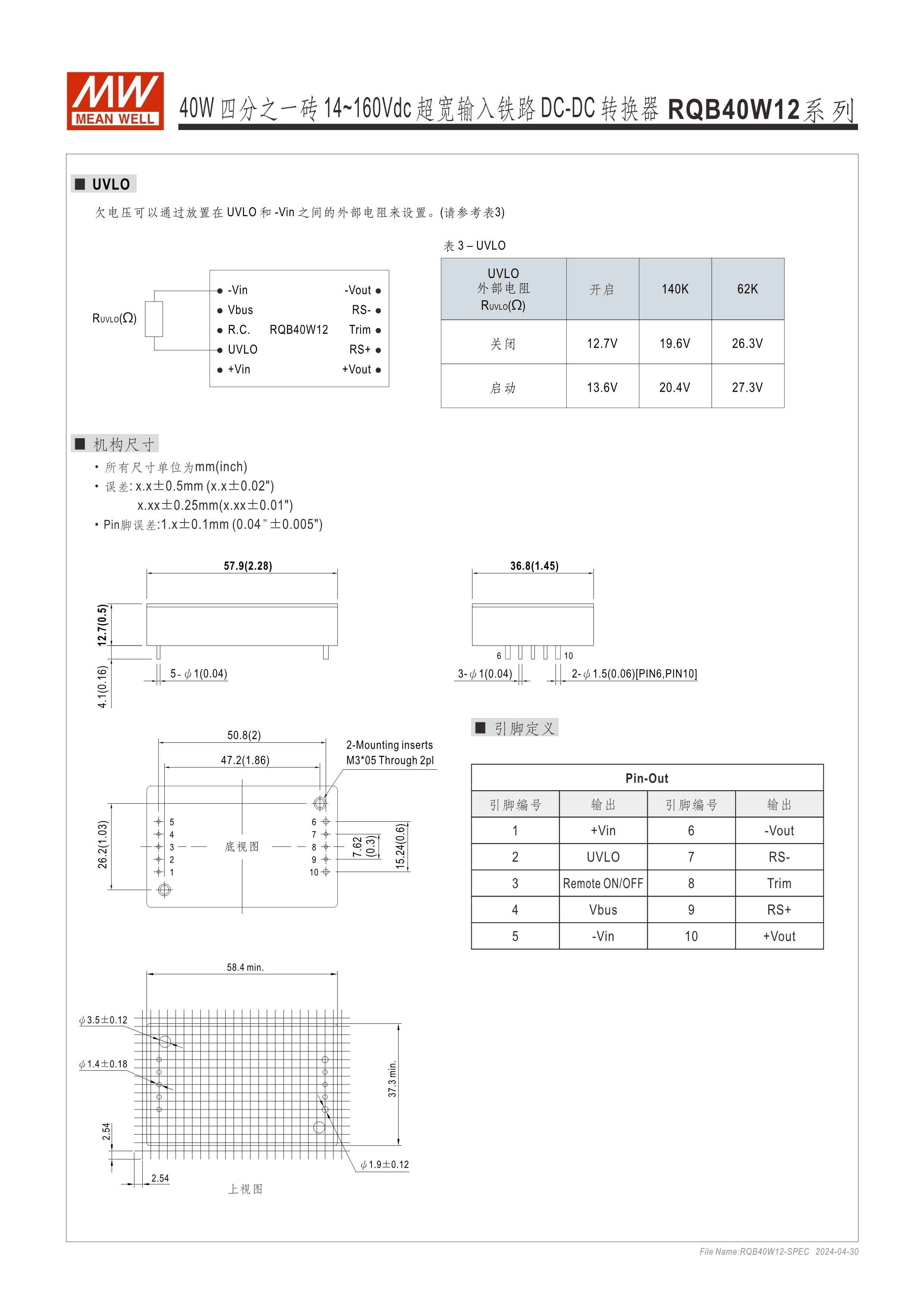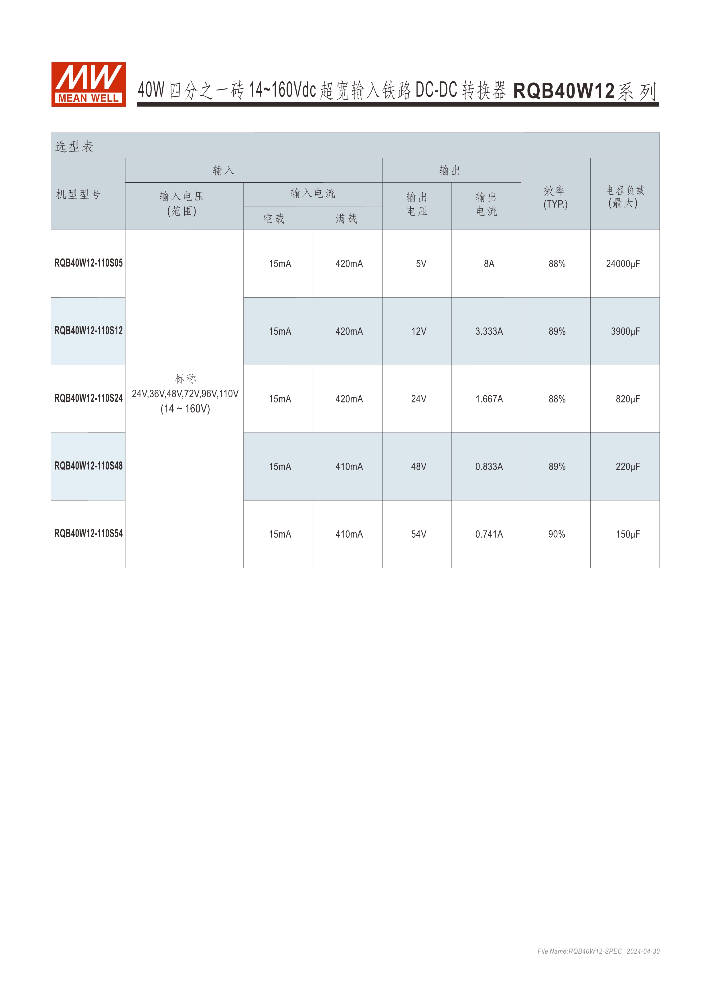 模塊型快選表 2.28” x 1.45” x 0.5”半磚尺寸 符合鐵路標(biāo)準(zhǔn)EN50155 40W: 12:1(14~160Vdc)超寬輸入范圍 ; 150W: 3:1(60~160Vdc)超寬輸入范圍 寬工作溫度范圍-40~+90oC 無需最低負(fù)荷 全封裝