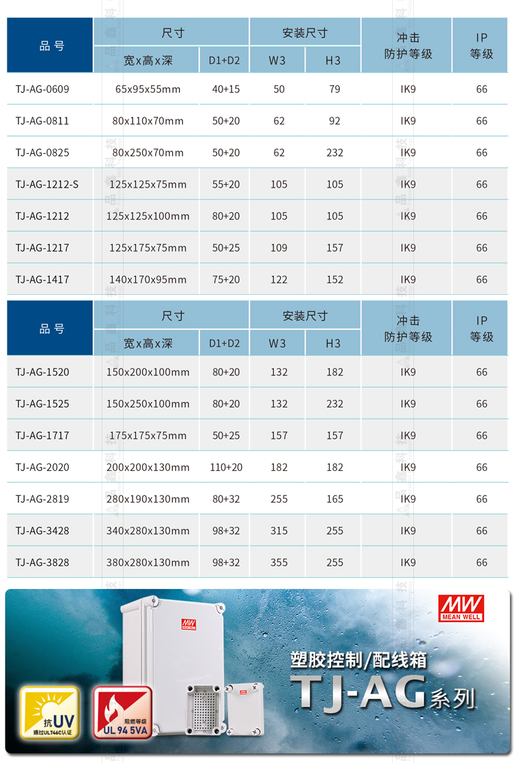TJ-AG-0609 (65x95x55mm) TJ-AG-0811 (80x110x70mm) TJ-AG-0825 (80x250x70mm) TJ-AG-1212-S (125x125x75mm) TJ-AG-1212 (125x125x100mm) TJ-AG-1217 (125x175x75mm) TJ-AG-1417 (140x170x95mm) TJ-AG-1520 (150x200x100mm) TJ-AG-1525 (150x250x100mm) TJ-AG-1717 (175x175x75mm) TJ-AG-2020 (200x200x130mm) TJ-AG-2819 (280x190x130mm) TJ-AG-3428 (340x280x130mm) TJ-AG-3828 (380x280x130mm)